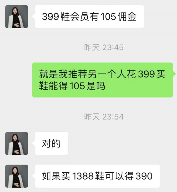 “买了鞋就自动拥有了会员资格,可以发展自己的团队了。”导师介绍,如果记者推荐另一个人加入团队,对方买鞋之后,记者还可以得到佣金。买一双399元的鞋可以得到105元。买1388元的鞋可以得到390元。这种模式,和线下常见的传销无异,只不过把传销搬到了网上。