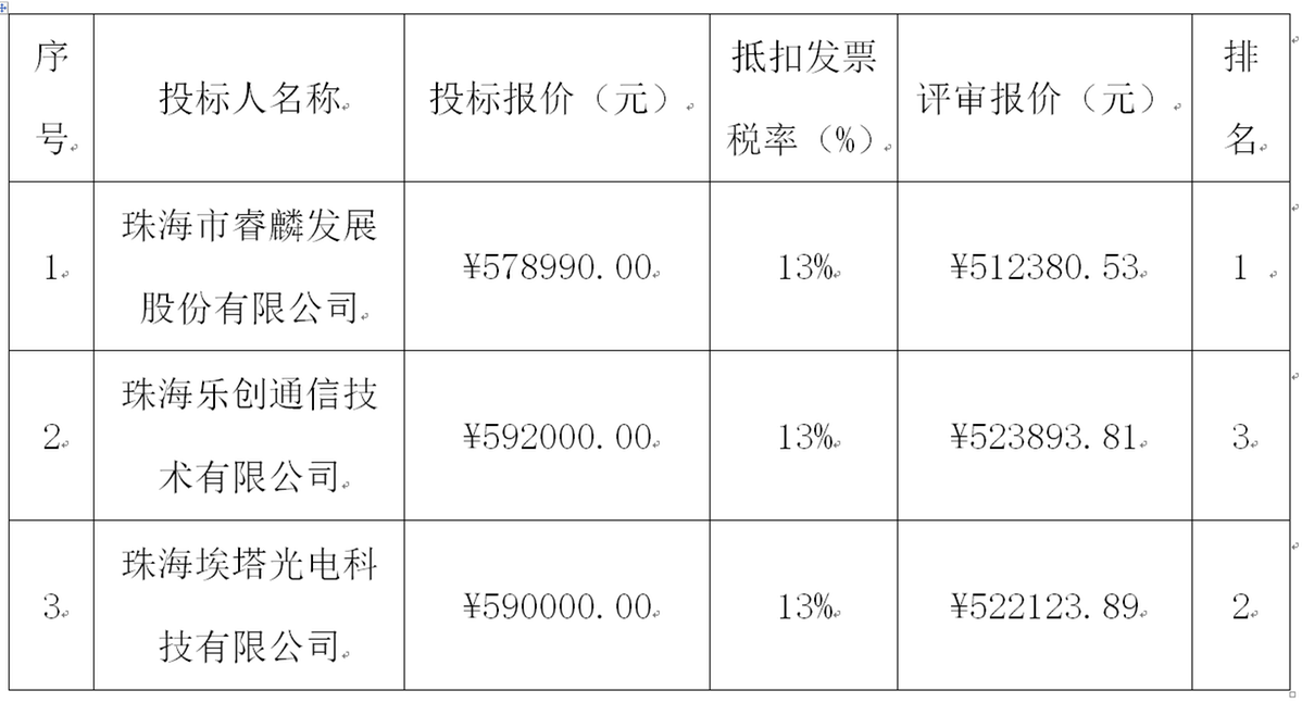 (3)第三成交候选人名称:珠海乐创通信技术有限公司;