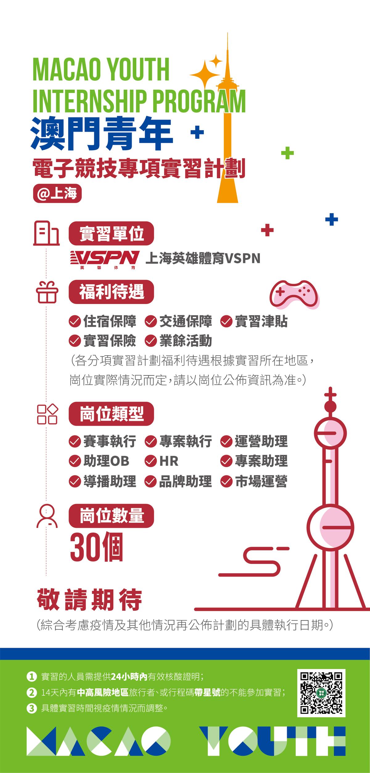 “澳门青年·现代金融产业专项实习计划”和“澳门青年·电子竞技产业专项实习计划”则由上海、广州等地区相关行业知名企业为澳门籍青年分别提供30个实习岗位,开展为期2-3个月的实习。主办方将综合考虑疫情发展及实际情况,适时公布该两项计划的报名时间及实习时间。