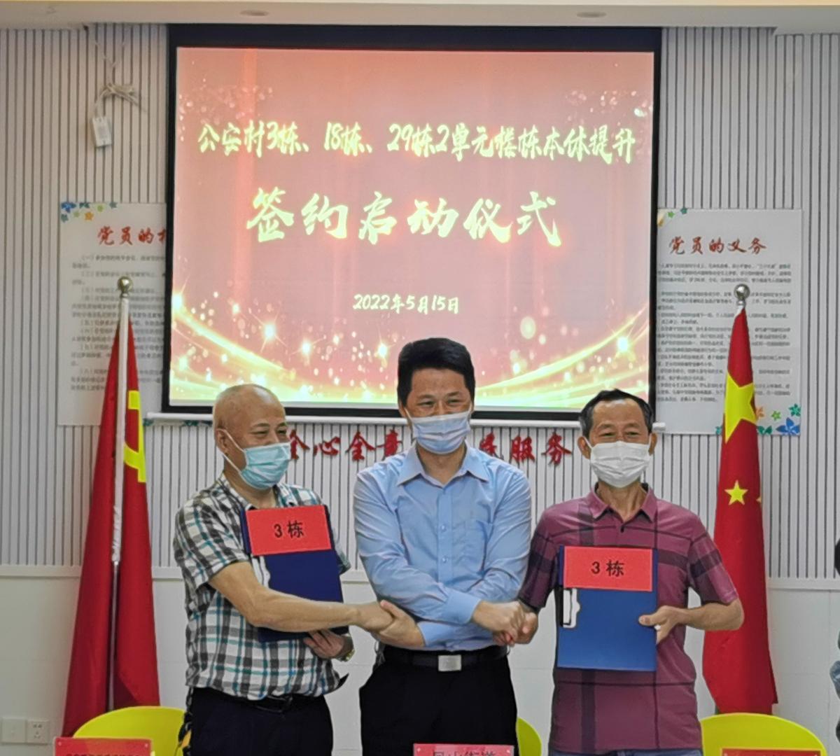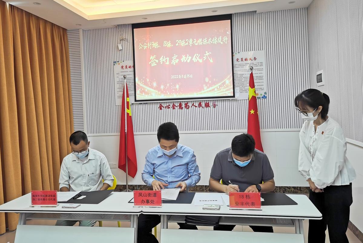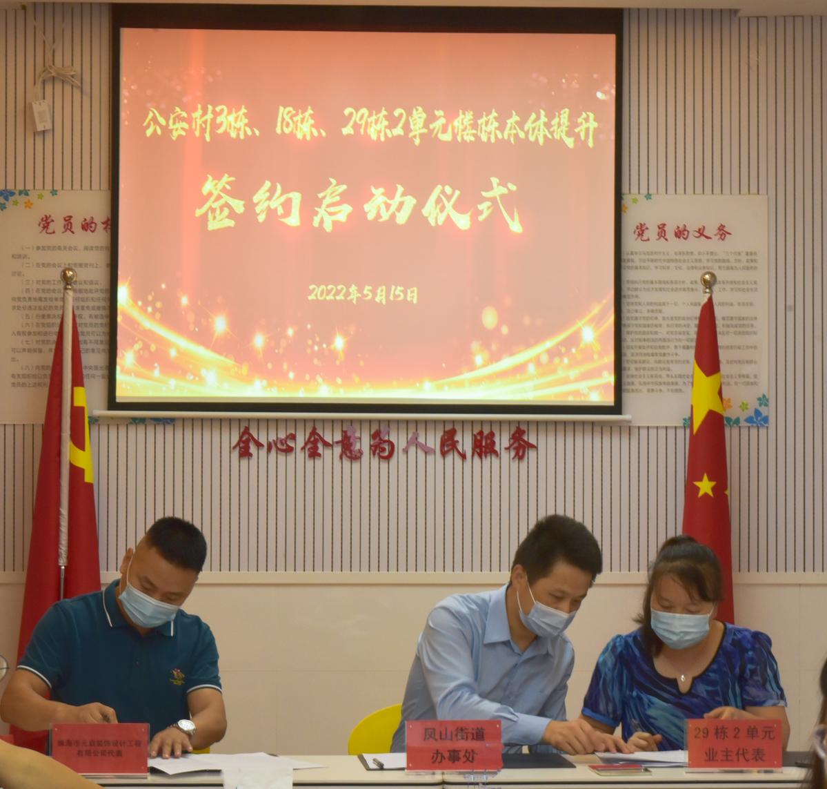 现场,凤山街道、各楼栋长、施工方代表共同签订《项目施工合同》,在响亮的礼炮声中,业主们迎来了“幸福项目”的正式启动。