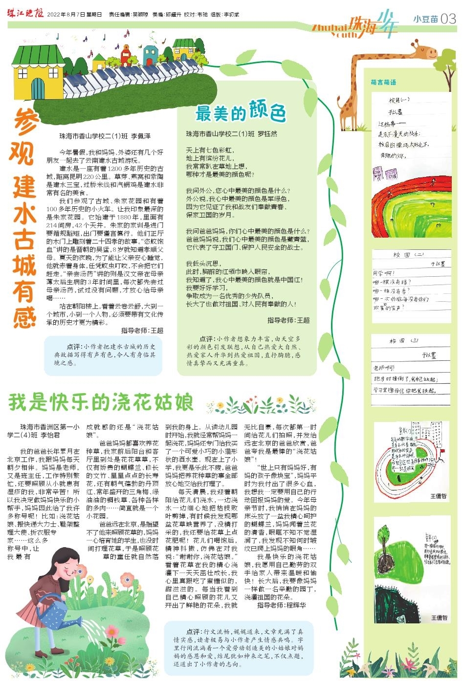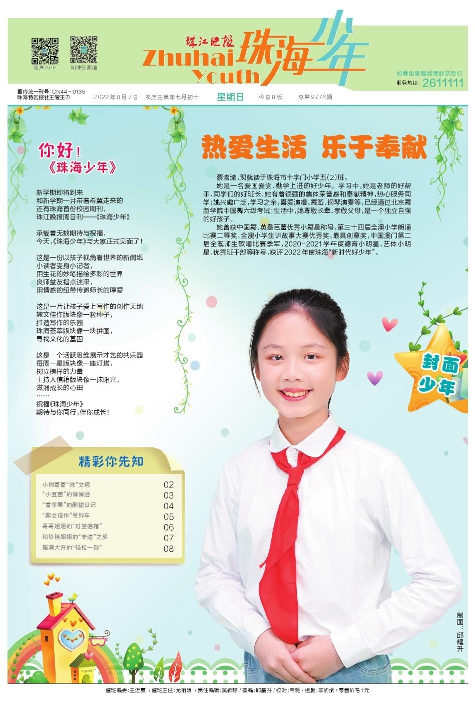 据了解,《珠海少年》每周日在珠江晚报出版,设有“每周一星”“小豆苗”“青苹果”“趣文佳作”“知心姐姐”“小树哥哥信箱”等多个精彩栏目,集知识性和趣味性于一体。将以新锐丰富的图文内容、清新活泼的版式风格为小读者们呈上丰富的精神大餐。欢迎小读者们变身小记者踊跃投稿,在《珠海少年》上刊登优秀作文、绘画作品,留下参加各类比赛、活动的身影……让《珠海少年》成为少年儿童健康快乐成长的励志周刊、益智读物、知心朋友。