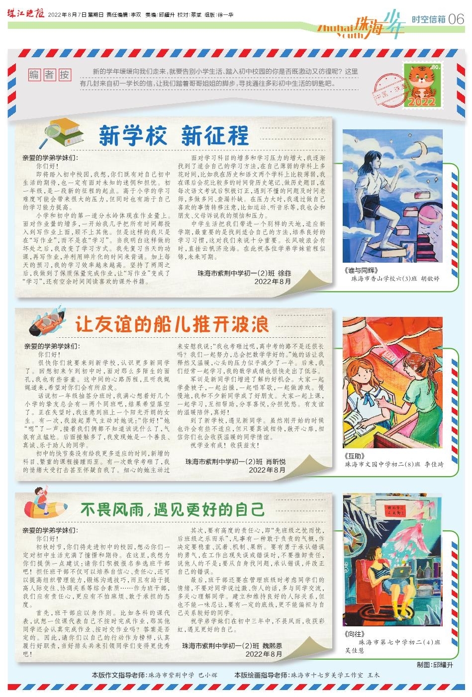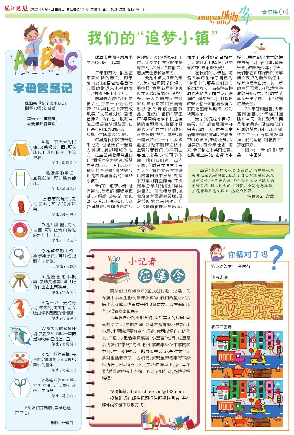 与你同行,伴你成长!珠海首份校园周刊——《珠海少年》今日正式创刊!这是一份以孩子视角看世界的新闻纸,让小读者变身小记者;这里有一片让孩子爱上写作的文学天地;这还是一个活跃思维、展示才艺的共乐园。《珠海少年》每周日在珠江晚报出版,每期刊发8个版。>>点击阅读