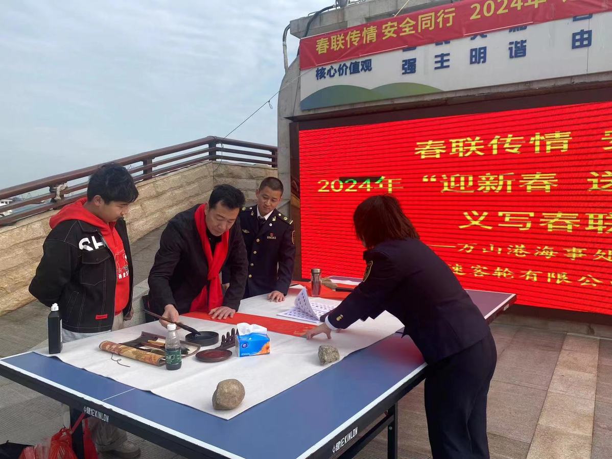 当天10时许,桂山岛正举行着一场别开生面的送春联活动。活动现场,珠海万山港海事处为群众播放水上交通安全宣传片,讲解安全乘船注意事项,吸引往来旅客和群众驻足观看。随后,现场举行了知识问答和救生衣穿着比赛。围观群众踊跃参与,在欢乐的互动中还收获了精美的小礼品。珠海海事局退休老党员费长达挥毫泼墨,把新春的祝福融入笔端,新鲜书就的春联逐渐铺满了案台。海事局工作人员为大家派发乘船安全须知手册,同时把饱含浓浓年味的大红春联送到群众手中。
