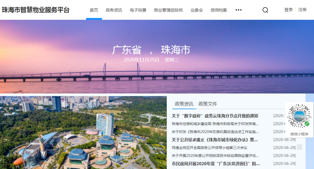 该平台主要面向广大市民、业委会及业委会筹备组、居(村)委会、物业服务企业提供了《珠海市智慧物业服务平台》微信小程序,《珠海市智慧物业服务信息网》(https://zhwy.zhpm.org/pc/)两个终端,为市、区、街镇三级行业管理单位提供了《珠海市智慧物业管理服务后台》。