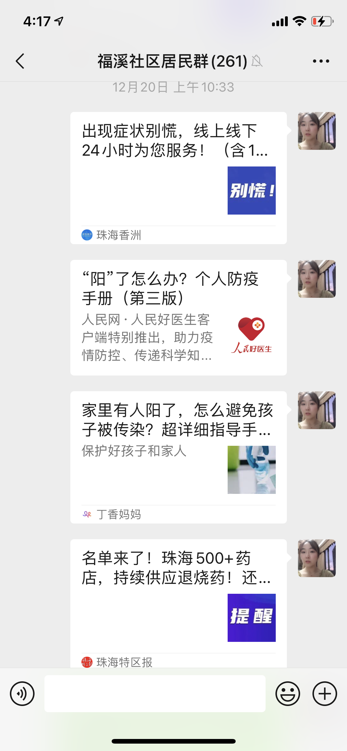 为做好居民感染新冠病毒后看病吃药问题,福溪社区及时建立“福溪社区居家服务群”,为社区自报阳性人员及社区家庭医生搭建起线上居家问医平台,让居家人员可通过微信群,及时反映身体情况,方便对家庭医生进行问诊答疑,指导居家人员做好病中的自我护理及用药情况。疫情期间,福溪社区及时在各居民群发布就近发热诊室、药房购药渠道、核酸开放点等信息,让群众踏实安心。