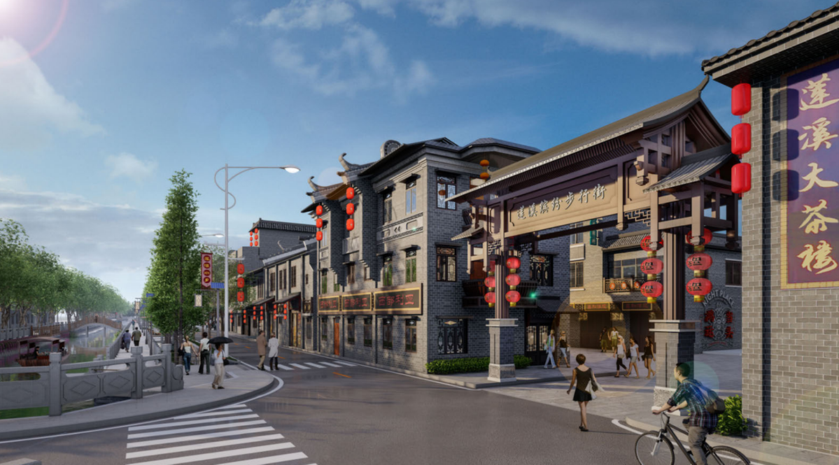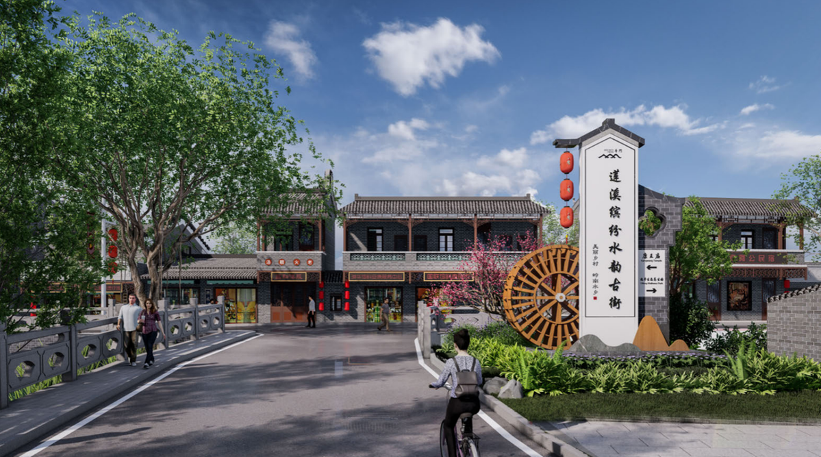 二期项目位于一期西侧,延续原有的风情商业街,河道长约300米,建设工程包括52栋房屋外立面改造,新建建筑面积约2500平方米的文创中心,景观改造范围约3.3万平方米,沿河北岸设置滨河人行道,形成人车分流动线,新增拱桥和亲水平台各一处,莲溪小学旧址重新改造为商业集市。