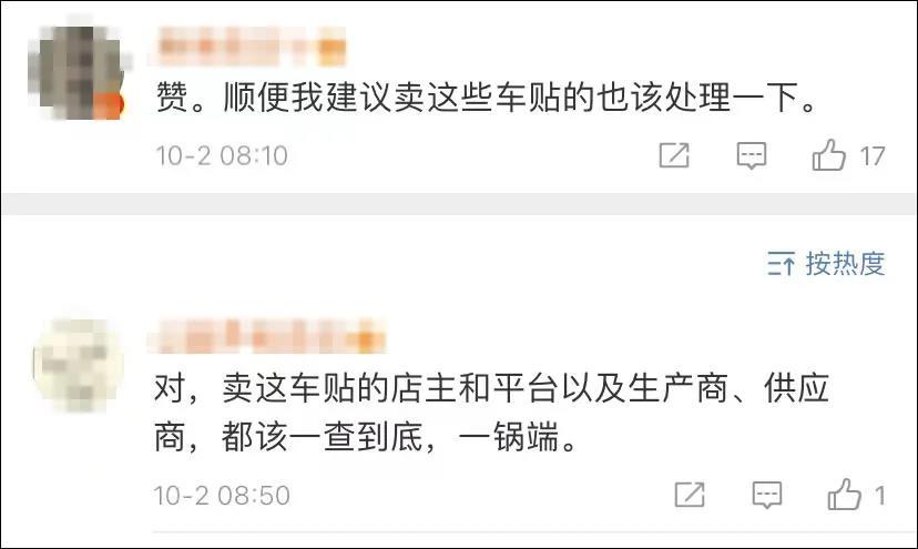 有网友表示,除了涉事车主,贴纸的生产商等相关单位也难辞其咎。