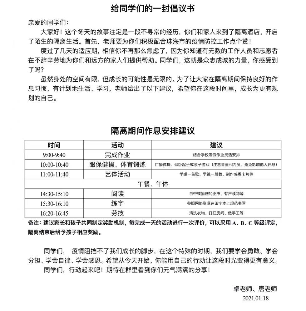 如何引导孩子们建立良好作息呢?经过香洲一小唐玮鸿、香洲四小卓玉仪两位老师连夜讨论,他们共同完成了一封倡议书,对隔离期间作息安排提出合理建议。