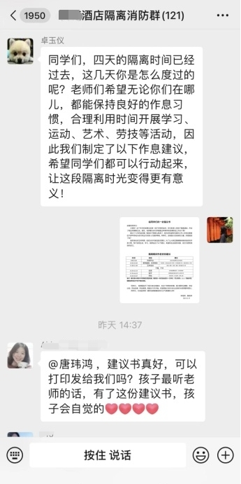 这份倡议书发布到群内之后,受到了家长和孩子们的欢迎,而且引起了示范效应——其他入驻隔离酒店的教师们也纷纷响应,根据隔离学生的实际情况,写下了一封封独具特色的倡议书,为孩子们的隔离时光添上明媚的色彩。