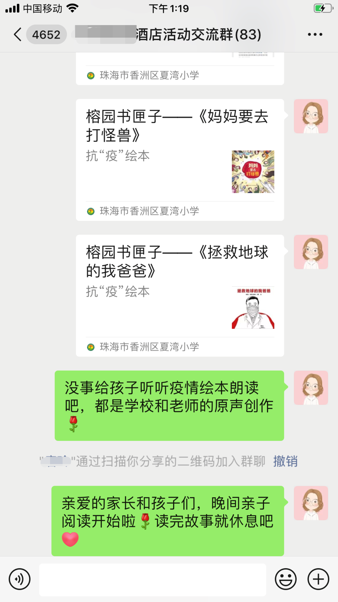 这时,黄老师想起学校曾开展的抗“疫”绘本课程,立马筹建了“酒店活动群”。晚上,她准时发布第一个“晚间阅读”活动,让家长和孩子们在原生态朗读中获得心灵的启迪。