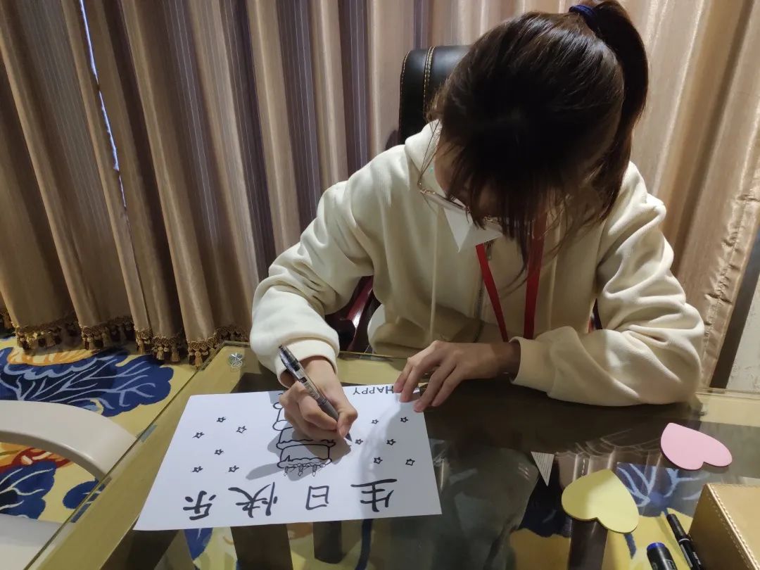 因为隔离酒店没法接收外卖,老师们无法订蛋糕,但他们马上通过电话给“小寿星”送上祝福,同时向酒店借用工具,亲手绘制了一张精美的贺卡。“小寿星”收到卡片以后非常开心,并向他们表示感谢。