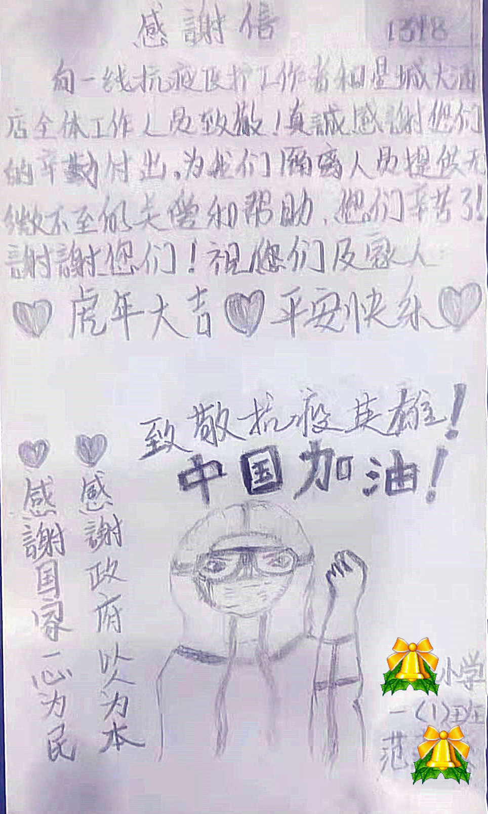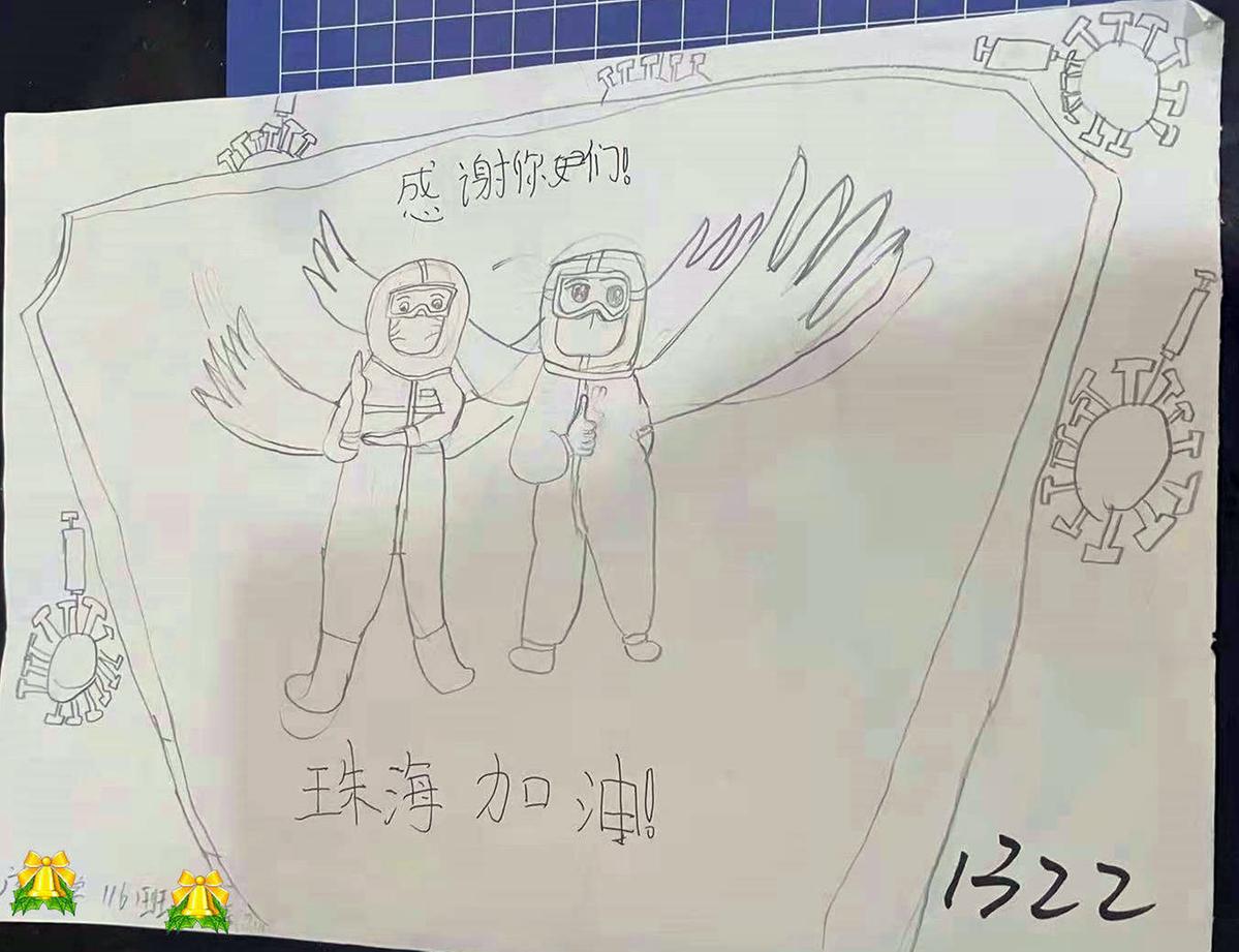“姐姐等一下,这个送给你们,谢谢你们,你们辛苦了!”1月23日上午,珠海市中西医结合医院的护士胡云梦和同事在隔离酒店珠海星城大为正在进行健康观察的人群进行上门核酸采样。当她给一名小女孩采完样后,这名女孩拿出自己绘制的“守护天使图”,送给胡云梦和其同事。