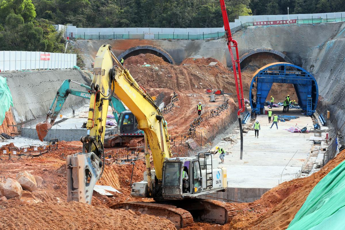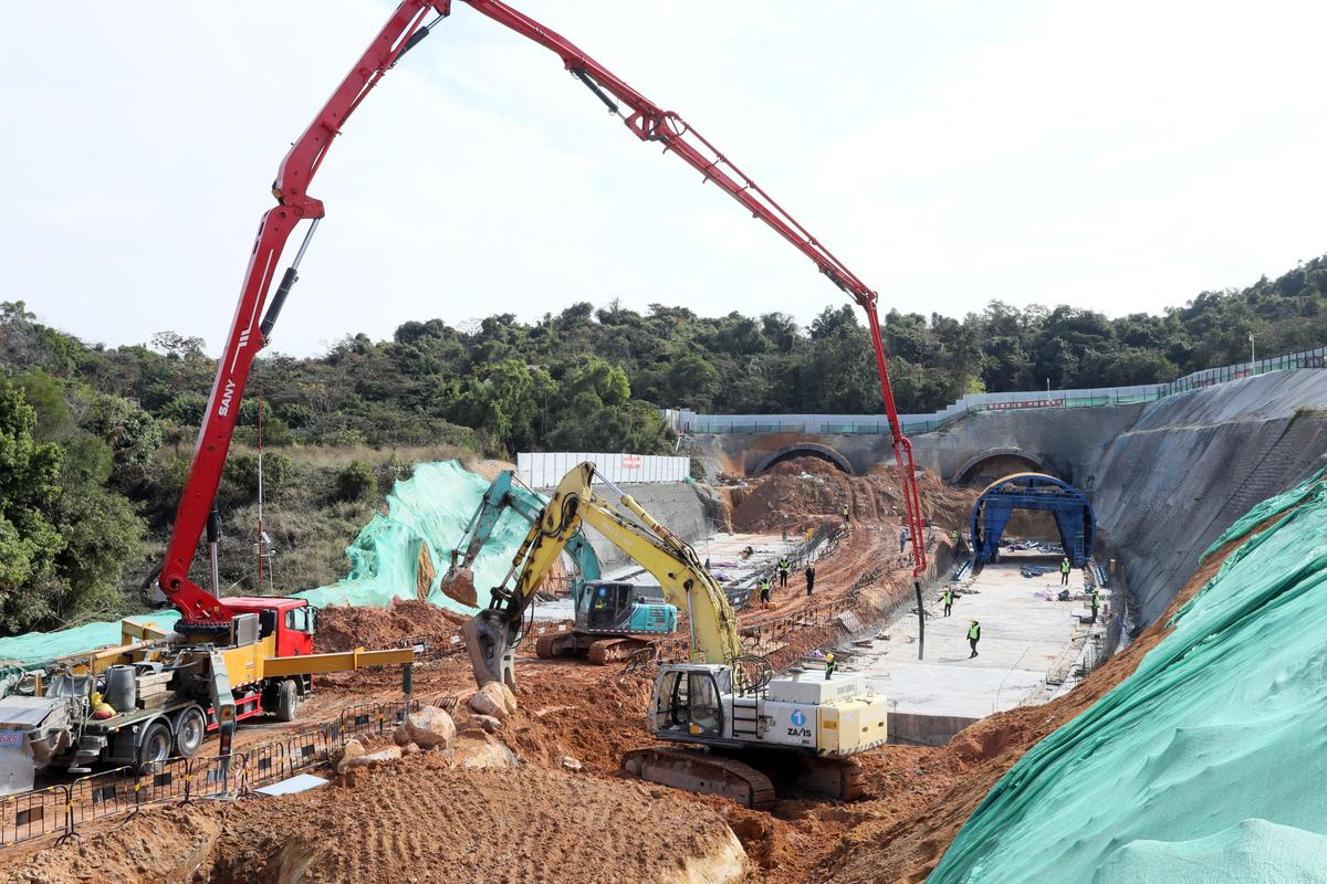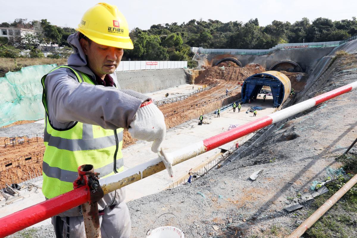 “轰隆轰隆”……在情侣中路菱角咀隧道工程(北端)洞口地段,伴随着持续不断的轰鸣声,一台台挖掘机、炮机、泵车正在现场热火朝天地加紧作业。数十名建筑工人正在现场忙碌,进行北端明洞仰拱的施工,在边坡上方,几名工人正在敲打加固护栏,保障施工安全。