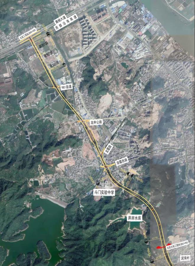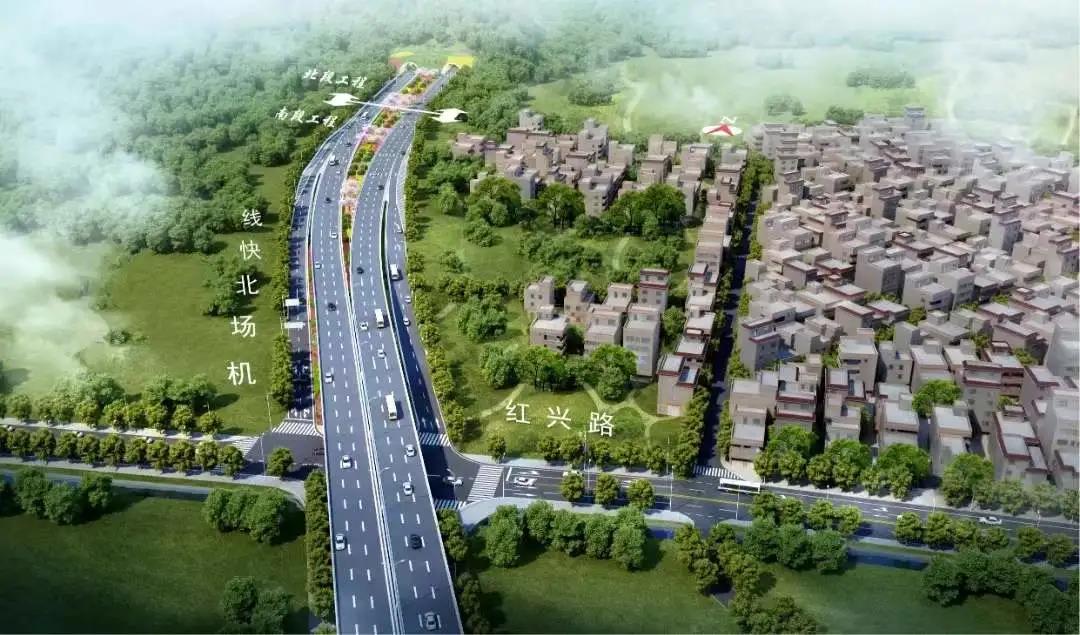机场北快线道路等级为城市快速路,北起黄杨大道,南至珠峰大道,全长约8.6公里,以红兴路为界,分为南北两段。本项目为北段工程,起于黄杨大道,经西部沿海高速、乡道Y613贵乾线、龙井路、港霞西路、井岸水库、接驳于坭湾村红兴路,全长3.9公里。