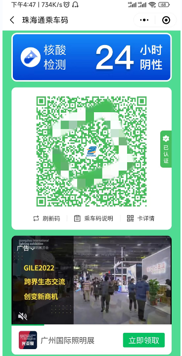 当前公交乘车支付方式多样,其中使用电子支付平台的乘车码是其中一种。记者从珠海通科技有限公司获悉,为方便市民单次打开界面即可完成核酸检测结果和粤康码核查并支付车费,该公司已在本月通过对接数据库,试行将乘客的核酸检测结果和时效展示在乘车码界面醒目位置,同时乘车码显示为绿色即代表乘客粤康码为绿码状态,公交司机核查时一目了然。乘客通过“珠海通”微信小程序授权认证开通后,点击“刷码乘车”即可向司机展示相关核酸检测结果并扫码支付车费。
