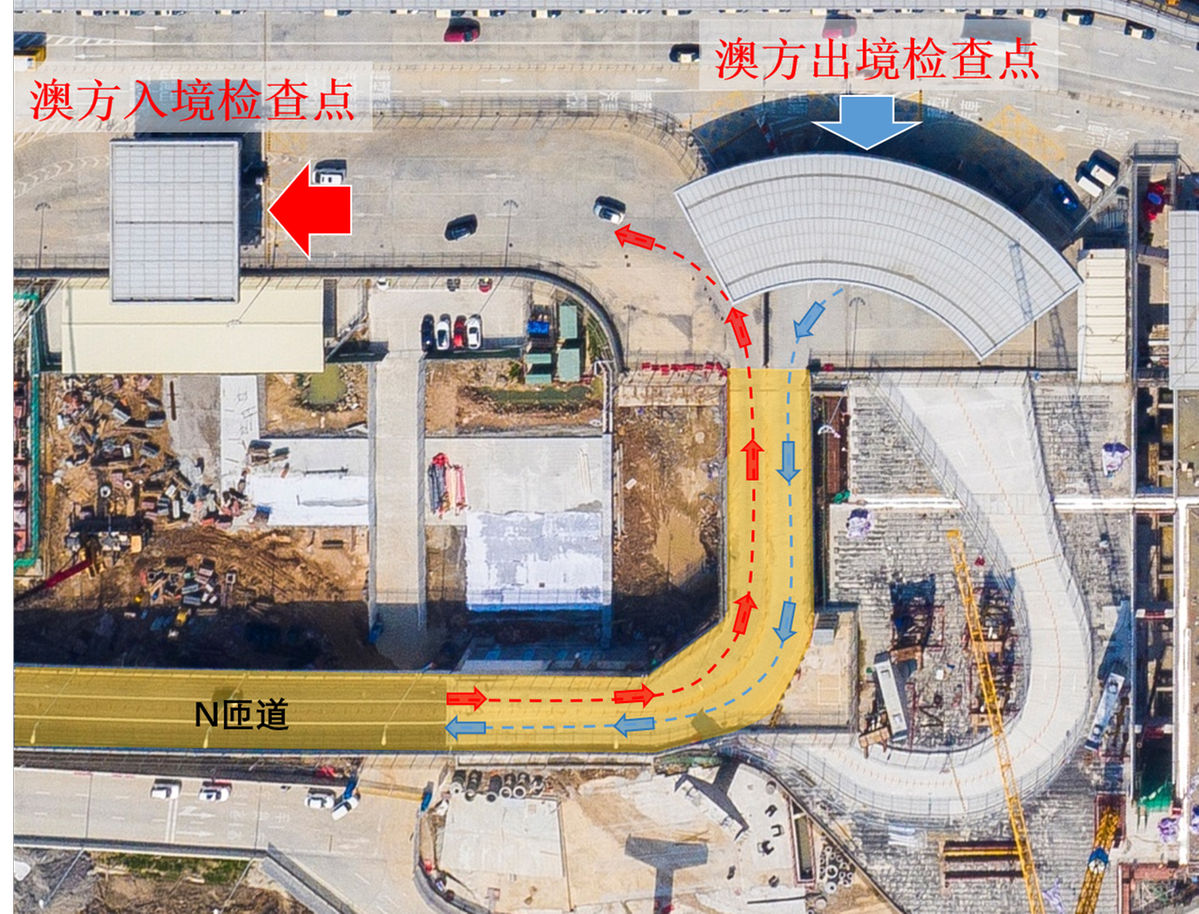 根据通告发布的交通流线图,记者发现,此次交通调整主要位于澳方入境检查点和澳方出境检查点附近匝道。