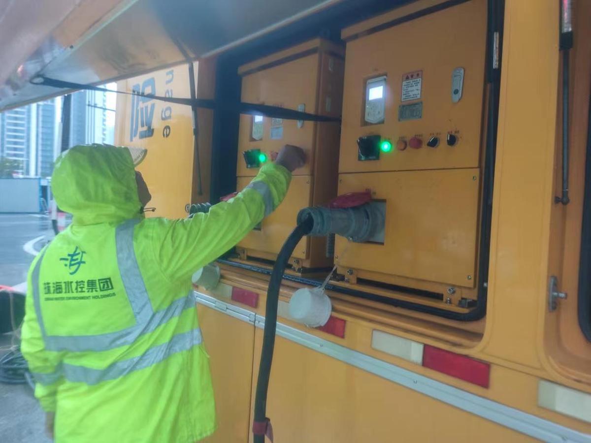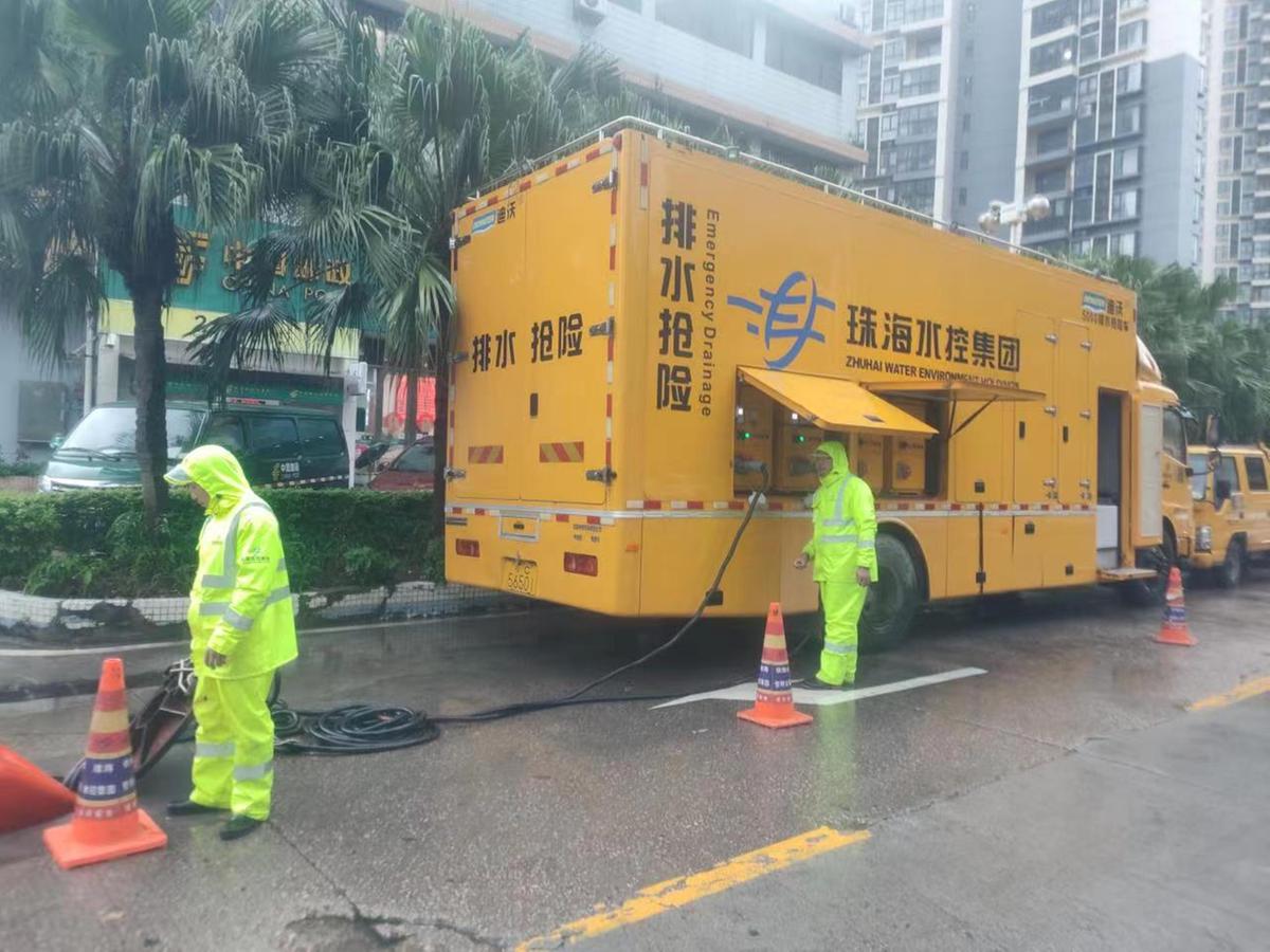 由于区域降雨强度强,香洲湾仔区域中盛路5月12日上午出现10-20厘米深积水。珠海水控集团管网公司派出最大功率排涝设备一一5000立方米/小时排涝泵车进行抽排导流,基本控制住了现场涨水势头。