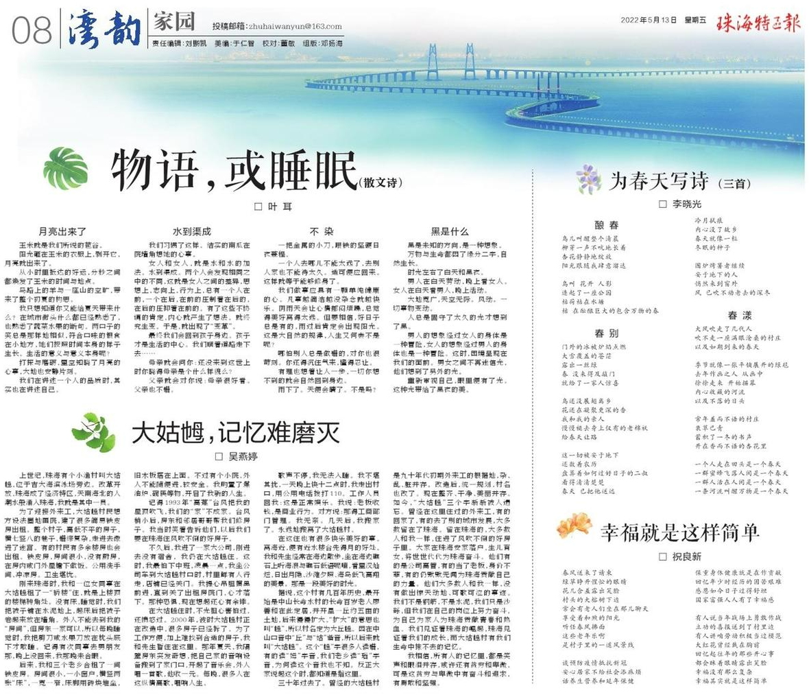 三十年过去了。曾经的大姑乸村是九十年代初期外来工的根据地,杂、乱、脏并存。改造后,统一规划,村名也改了。现在整齐、干净、美丽并存。如今,“大姑乸”三个字渐渐被人遗忘。曾经在这里住过的外来工,有的回家了,有的去了别的城市发展,大多数留在了珠海。留在珠海的,大多数人和我一样,住进了风吹不倒的好房子里。大家在珠海安家落户,生儿育女,将世世代代为珠海奋斗。他们有的是公司高管,有的当了老板,身价不菲,有的仍默默无闻为珠海贡献自己的力量。他们大多数人和我一样,没有做出惊天动地、可歌可泣的事迹。我们不是钢筋,不是水泥,我们只是沙砾,但我们在自己的岗位上努力奋斗,为自己为家人为珠海贡献青春和热血。我们见证着珠海的崛起,珠海见证着我们的成长,而大姑乸村有我们生命中抹不去的记忆。