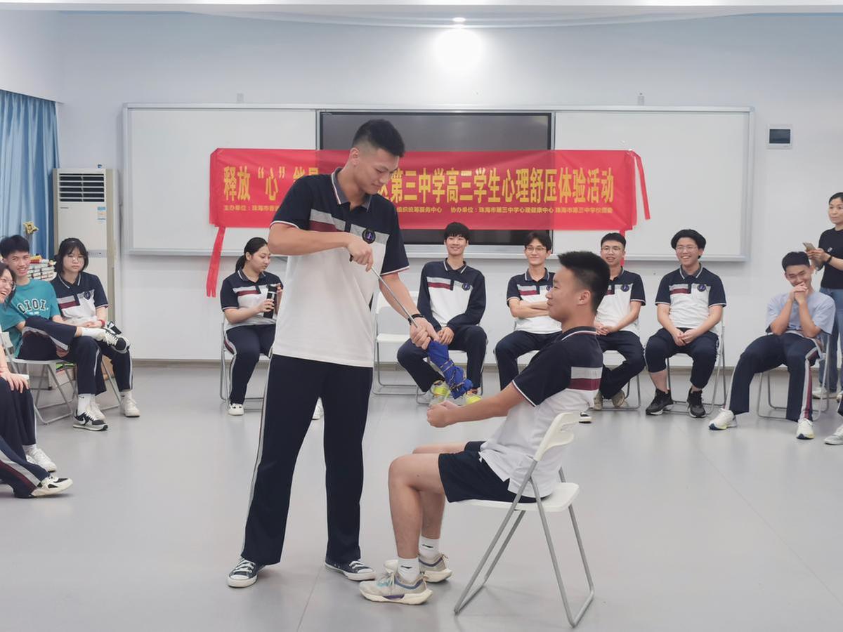 临近高考,学生面临着诸多压力,情绪紧张,为缓解广大考生考前心理压力,5月23日,由香湾街道团工委主办的释放“心”能量心理释压进校园体验主题活动在珠海市第三中学心理教室开展,为40余名高三学子进行了一场精彩又实用的心理减压活动。