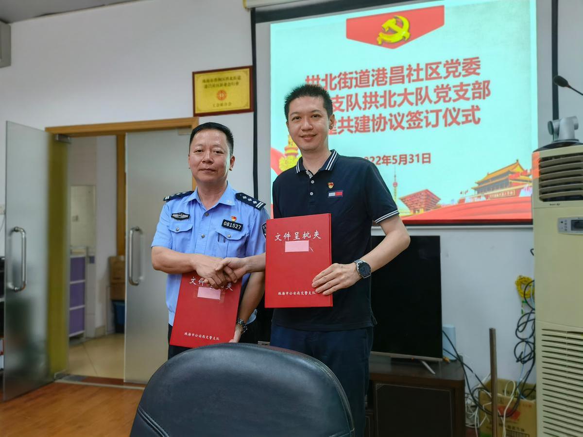 随后,港昌社区党委与市公安局交通警察支队拱北大队党支部举行了社区交通管理服务站揭牌仪式并签署党建共建协议。后续,拱北交警大队将会指定专人驻点社区交通管理服务站工作,让交警服务工作深入社区基层,进一步强化“邻里交警”理念,拉近警民之间的联系,为打造和谐社区、幸福社区提供助力。