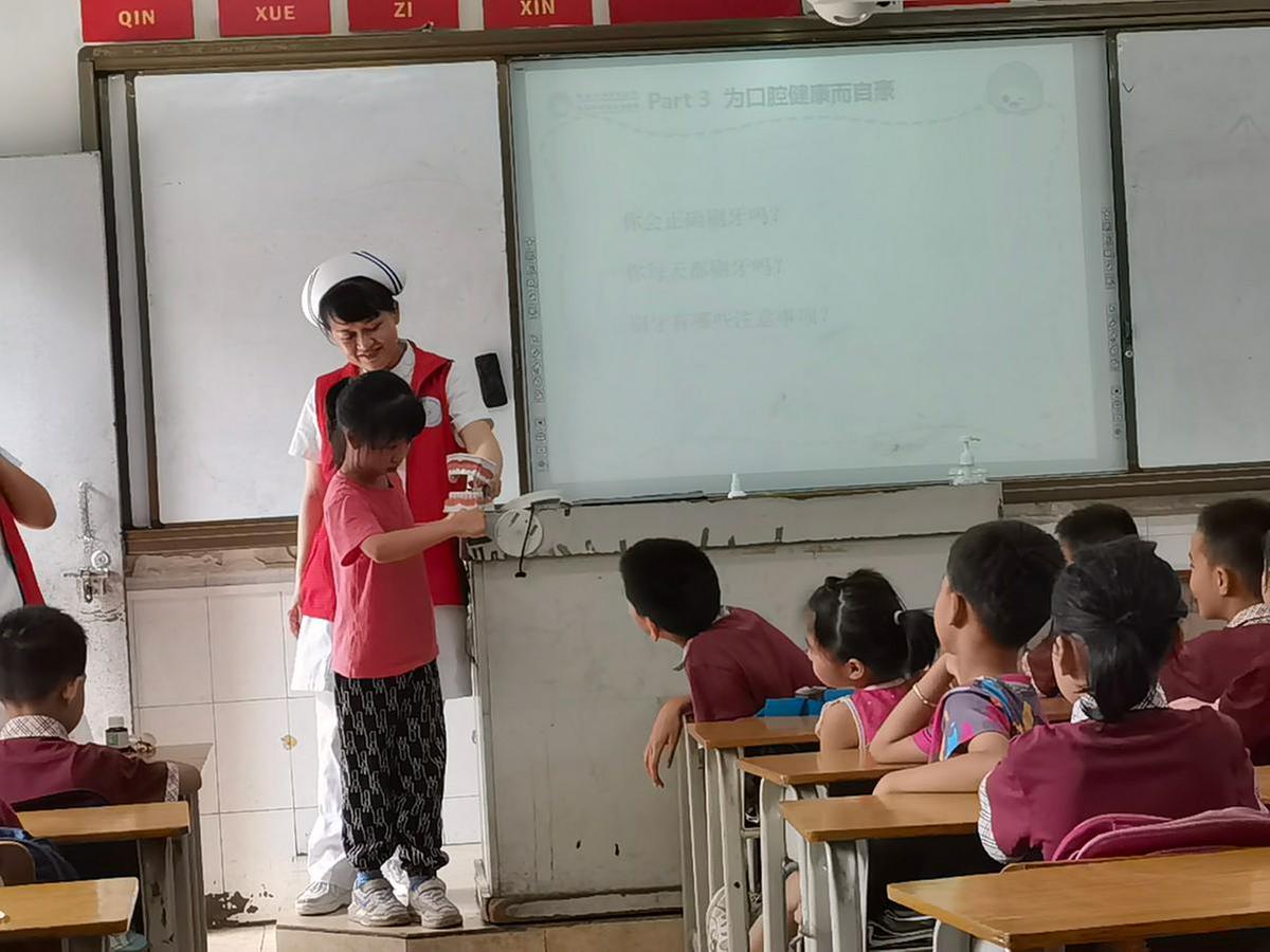 活动中,爱心医院医生为同学们讲解了日常卫生健康的重要性,播放了儿童常见传染病防治教育主题视频,演示了“七步”洗手法、清洁牙齿的正确方法,并为同学们传授“海姆立克急救法”的应急救护学习。医生还带来了学习教具让同学们现场亲自模拟实践,指导大家学会正确的手法;同时还进行急救知识有奖问答,吸引同学们踊跃参与。活动最后,中国人寿保险公司工作人员还为同学们送上了学习礼包和急救包,为社区流动儿童送上祝福与关爱。