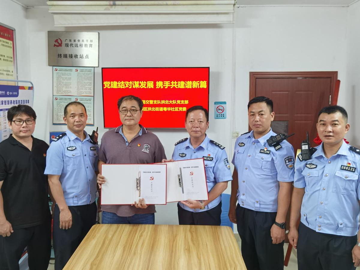 为进一步提升辖区道路出行安全畅通程度,打通为民服务最后一公里,6月14日下午,拱北街道粤华社区党委联合市公安局交警支队拱北大队党支部举行“党建结对谋发展 携手共建谱新篇”共建签约仪式,推进“交警进社区”的工作模式,推出便民服务新举措,通过点对点服务将交警多项便民服务送到居民“家门口”,服务群众“零距离”。