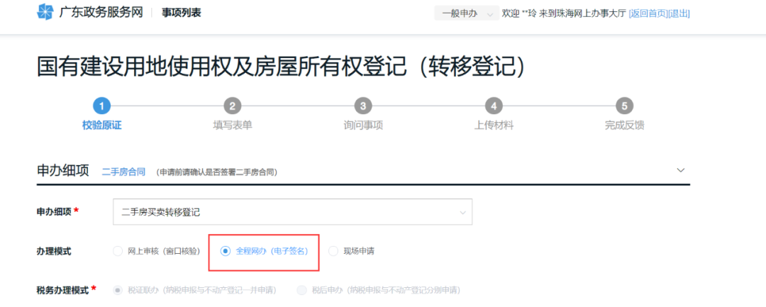 2. 进入网上申办页面,选择“全程网办[电子签名(章)]”模式,系统会自动选择“税证联办(纳税申报与不动产登记一并申请)”;