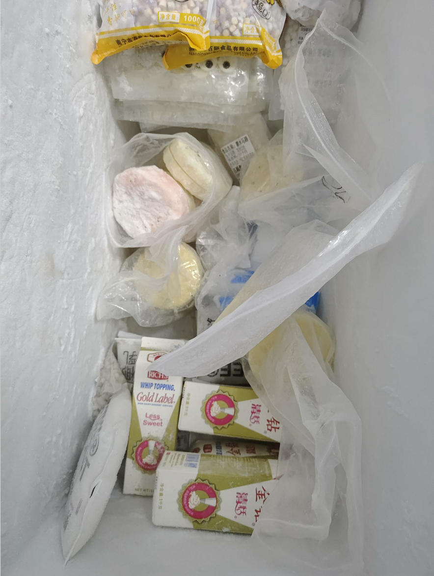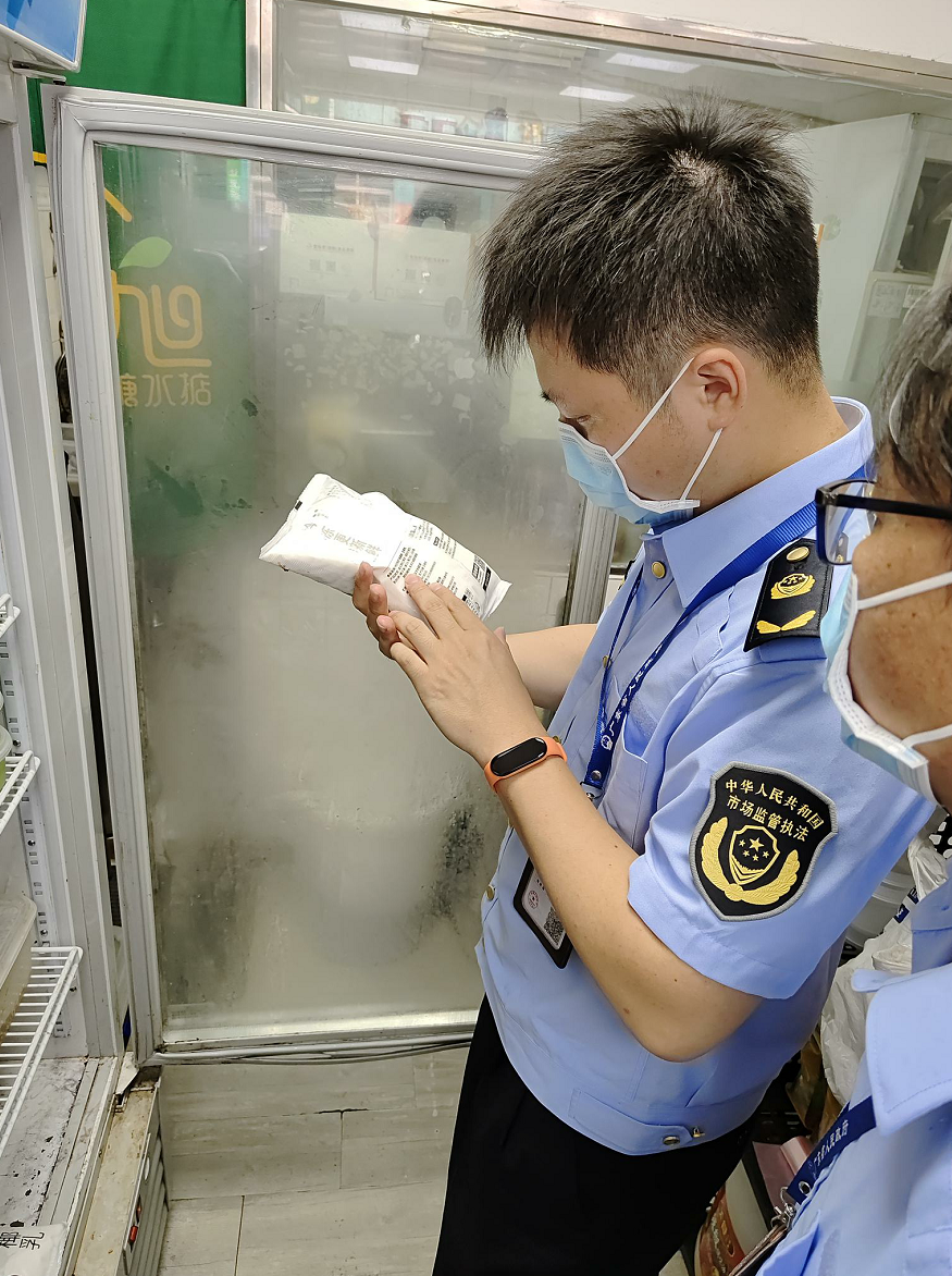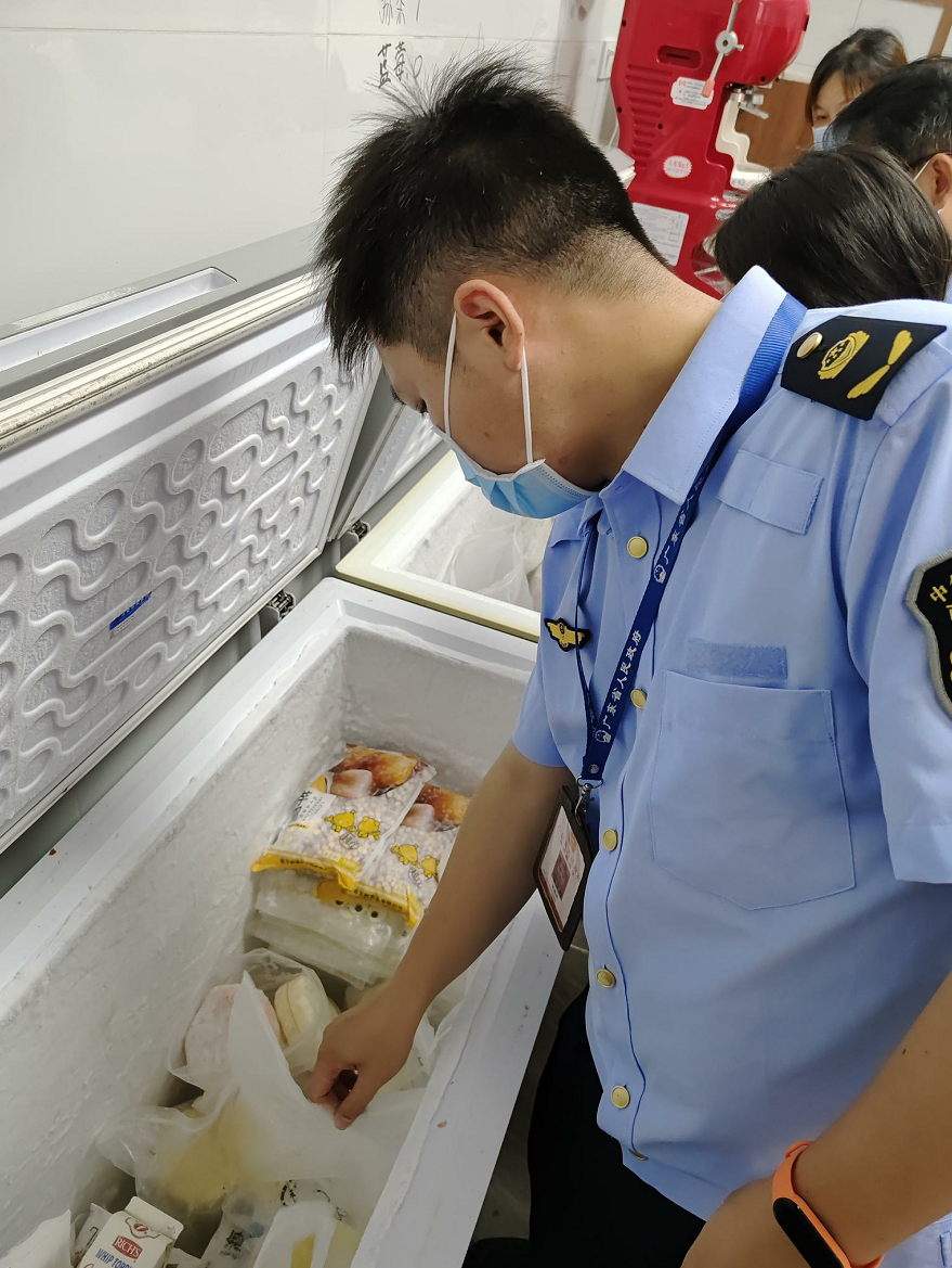 经检查,雪怪绵绵卫生总体状况良好,证照齐全、从业人员健康证在有效期内,但存在冰箱内食品未密封贮存的问题,执法人员现场责令其限期进行整改。