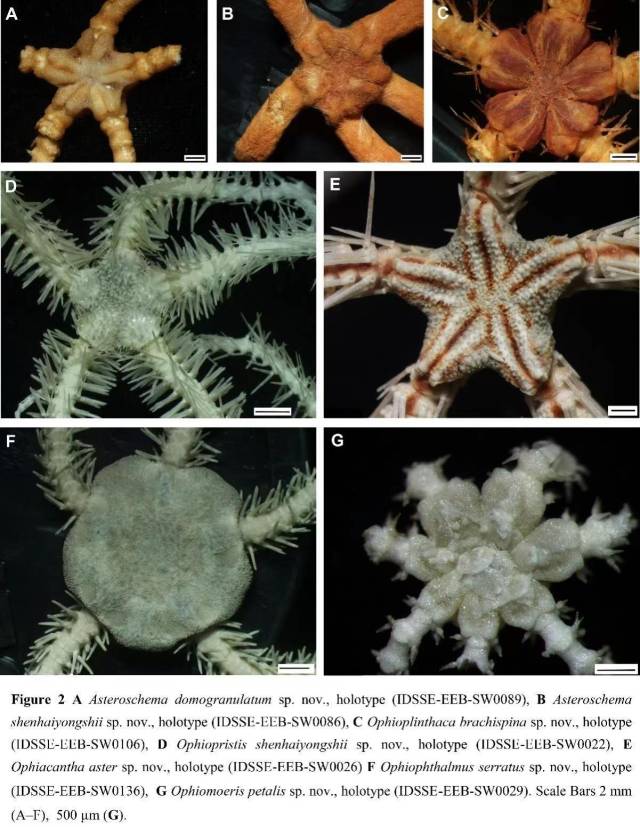 据中国科学院深海科学与工程研究所消息,近日,该所研究员张海滨团队及其合作者在南海及西北太平洋海域发现多个深海蛇尾新物种及新记录种,相关三篇研究论文分别发表在ZooKeys、EuropeanJournalofTaxonomy上。
