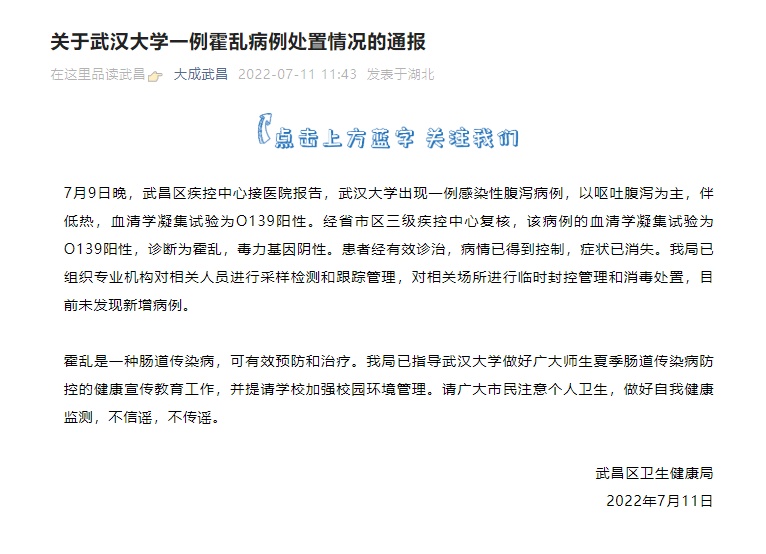 武汉大学出现一例霍乱病例,官方通报处置情况