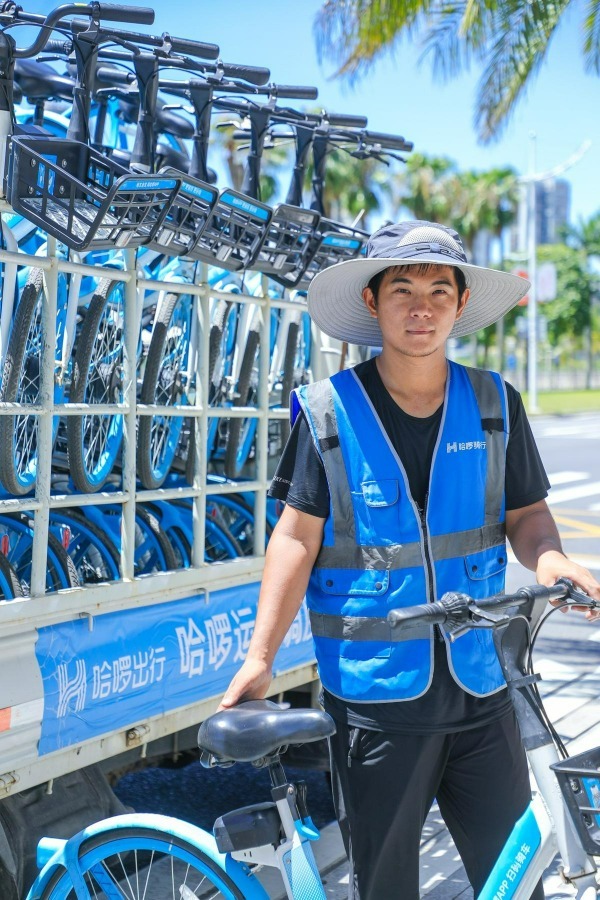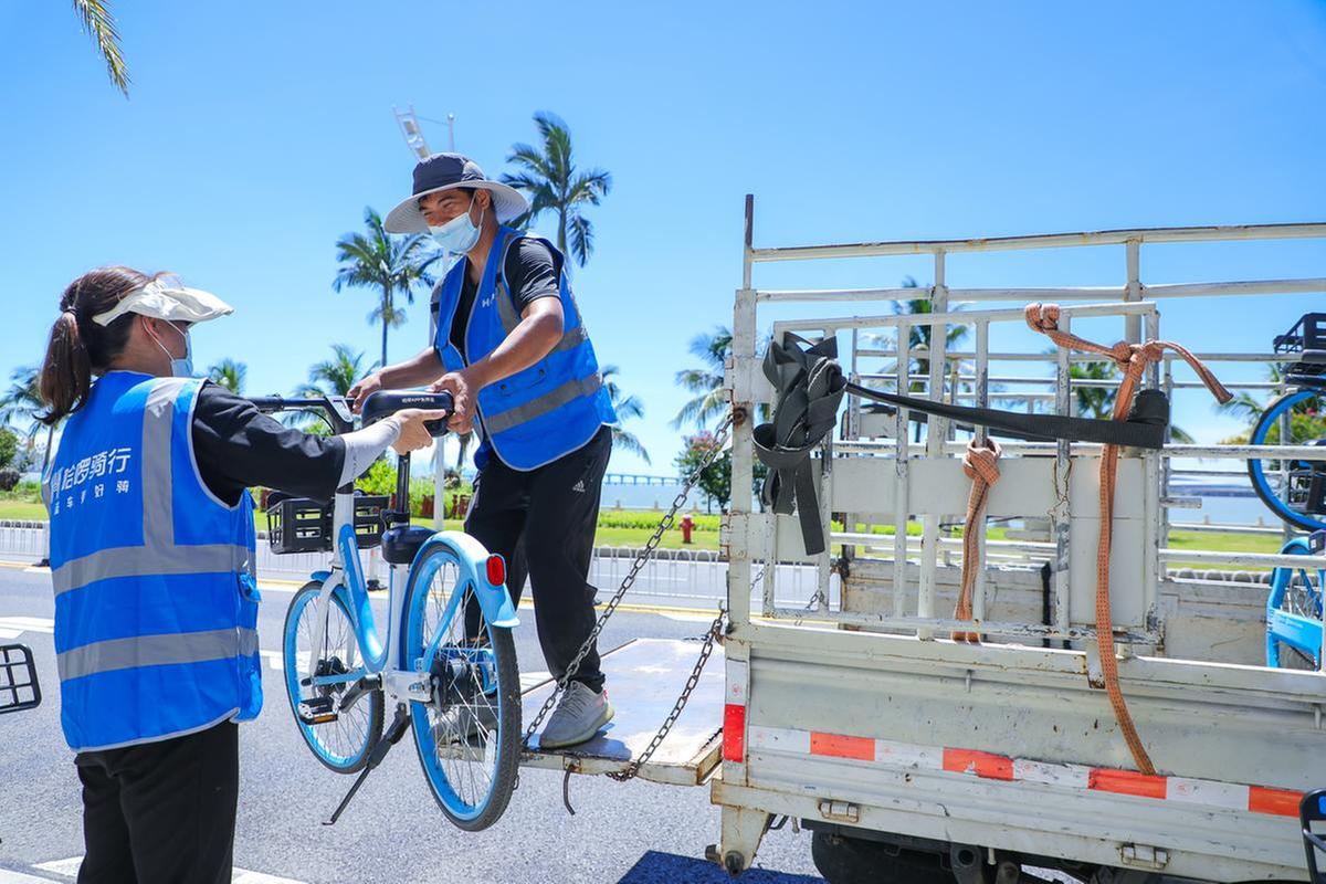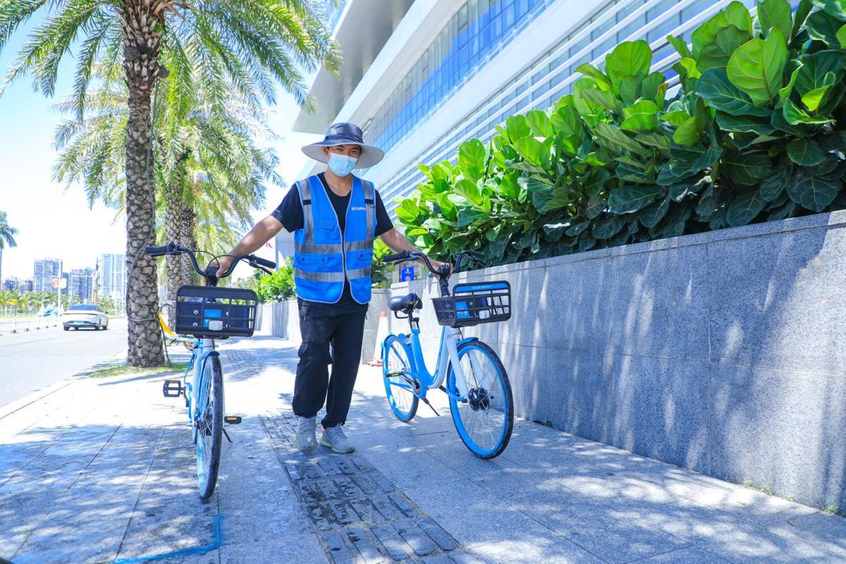 他的爱人也来帮忙,“夫妻档”勠力同心,一辆辆单车在他们的搬运下整齐停放在停车点,多余的抬上车运往别处,方便其他市民。“一开始会很累,但慢慢就习惯了。”忙碌的间歇,他在树荫下短暂休息,很快又要投入到下一段车辆转运工作中。“为了让大家出行更安心,配合防疫,同事还会对车把、车筐等关键部位进行消毒擦拭。”