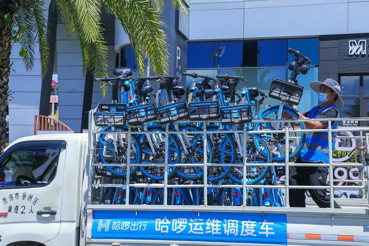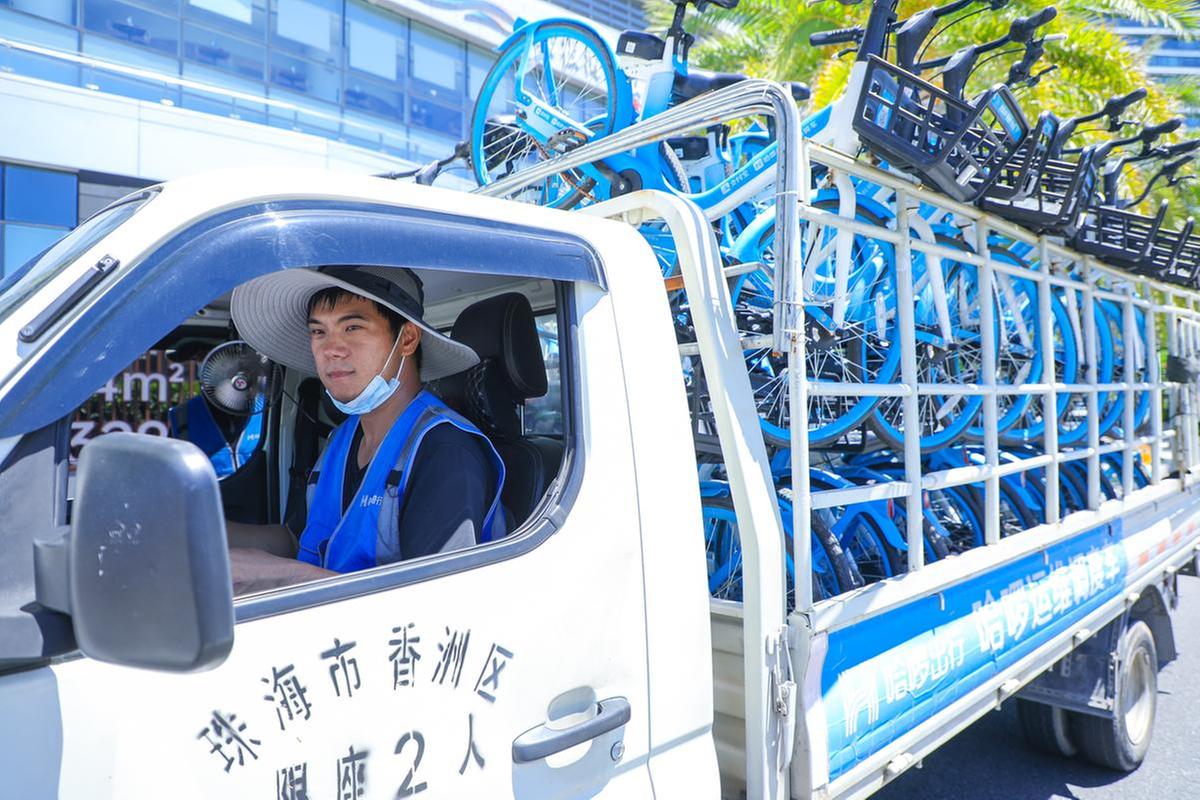 【黄少丰,共享单车运维工作人员。烈日下穿梭拱北的大街小巷,他驾驶着货车将共享单车均衡配置到市民出行必经的停放点。共享单车是不少市民短途出行的“摆渡”工具,他是单车“摆渡人”,也为城市文明“摆渡”到新高度努力着。15日,他正在街头搬运共享单车。】