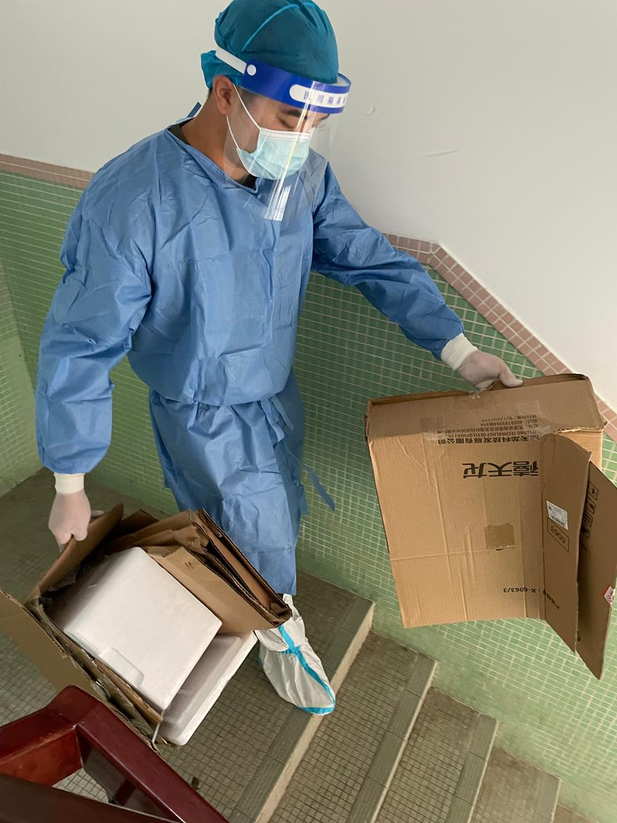 有的时候会出现同时封控几栋楼的情况,他总是刚忙完一栋又跑去另外一栋,还要挨家挨户敲门通知居民们依次下楼做核酸,几个小时喊下来口干舌燥,可他从来没有抱怨过一句。