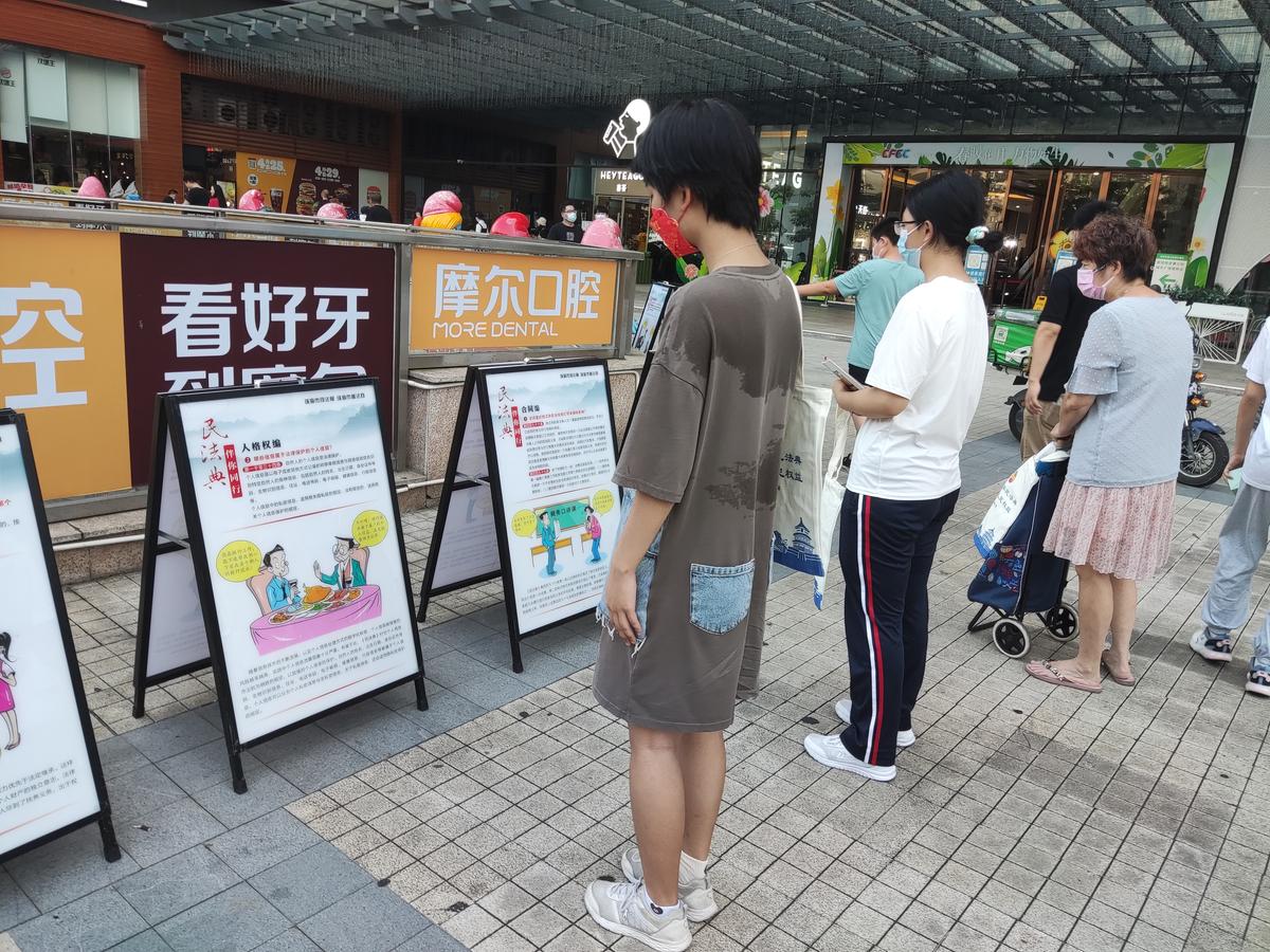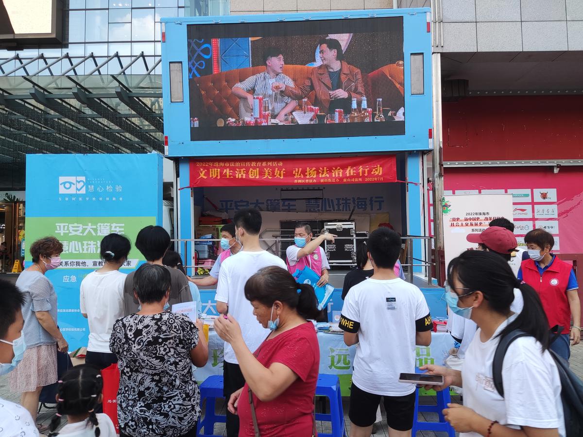 轻松幽默的普法相声、感人至深的普法微电影、高端法律知识访谈、生动活泼的普法动漫……这些流行文化元素和节目,都在普法大篷车大屏幕里滚动播放。这些法治宣传教育片囊括了宪法、民法典、防电信诈骗、垃圾分类等法律知识,吸引大朋友小朋友们驻足观看,普法大篷车成为活动现场最吸晴的“C位”!,不仅如此,主办方还在诚丰广场门口摆放着“民法典”主题知识展板,分篇章介绍了与生活息息相关的民法知识点,以案说法、通俗易懂。
