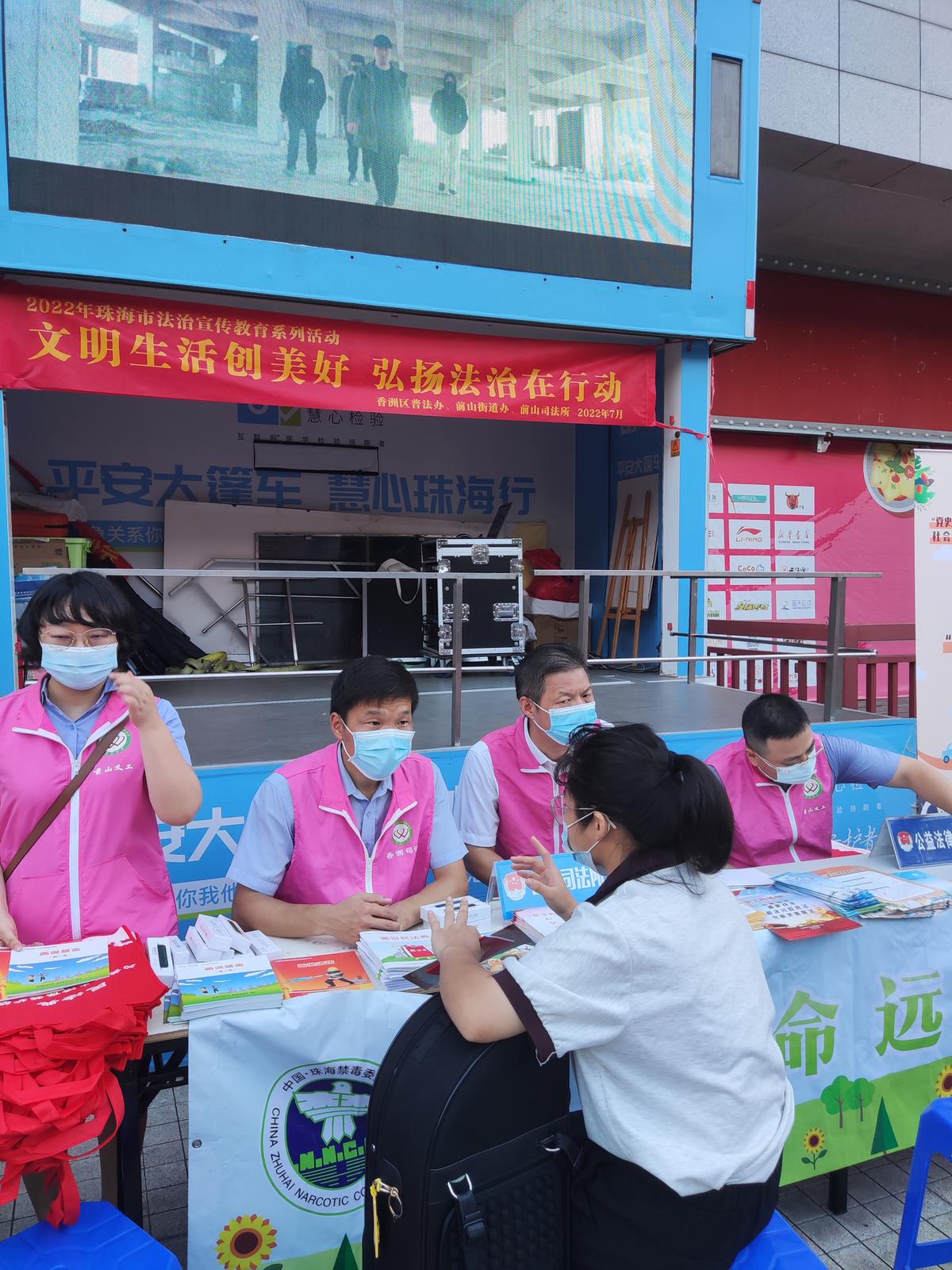 为推进全国文明城市建设工作,丰富市民群众的法治文化生活,进一步提升市民群众对法律法规的知晓度、法治精神的认同度、法治实践的参与度,7月31日,珠海市司法局、香洲区司法局联合前山司法所、前山综治办、岱山社区居委会在前山街道诚丰广场开展了一场主题为“文明生活创美好 弘扬法治在行动”的法治宣传教育活动,当天活动吸引了500名居民参与,共派发各类宣传资料及普法小礼品2000余份,现场解答居民法律咨询7宗。