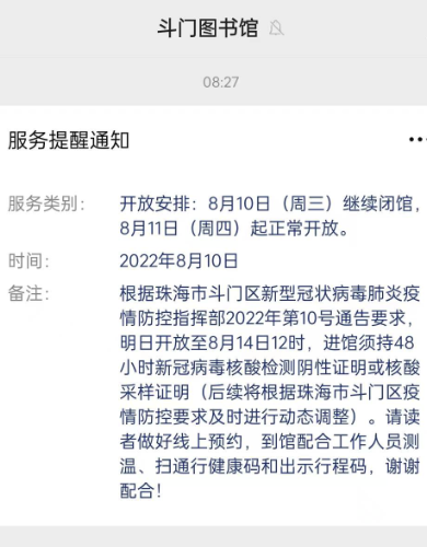 8月10日斗门区图书馆继续闭馆,11日起正常开放