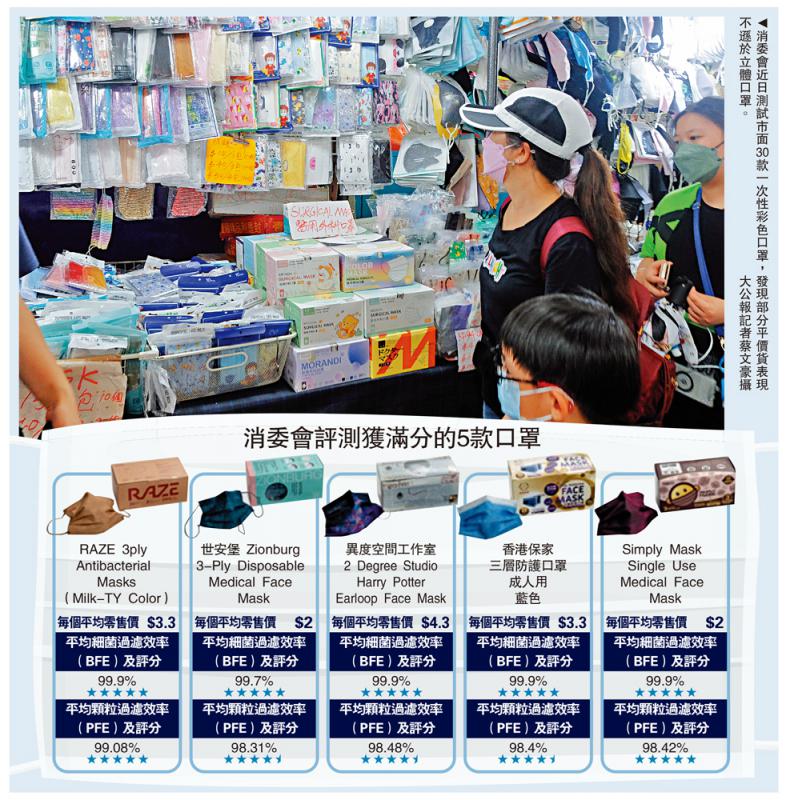 5款整体表现较佳、获得5分满分的口罩,分别是:RAZE、世安堡、异度空间工作室、香港保家三层防护口罩成人用蓝色,及Simply Mask口罩,每盒售价介乎60至128元,平均每个2至4.3元,BFE、PFE等重要指标均获得4.5分或以上,呼吸舒适度较佳,耳带亦比其他牌子坚固,不易拉断。而Stand Out、本土好罩、救世等、H-PLUS、CASETiFY和Medox口罩每克细菌菌落总数超标,其中CASETiFY的含菌量属最高,录得大于219.9,即超标约6.33倍。若从性价比计算,有平均售价2元一个口罩在各测试项目均有良好表现,整体效用并不比立体口罩,或平均售价为4元一个的口罩差。