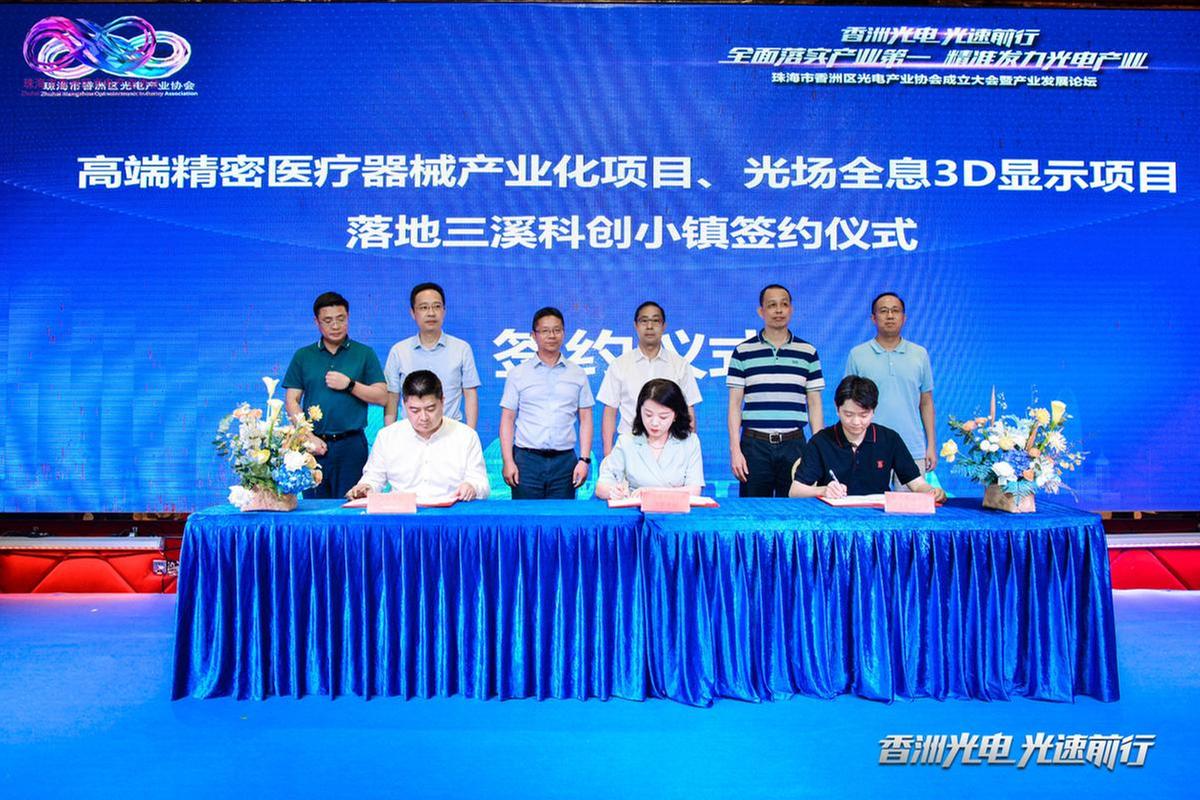 在随后举行的签约仪式上,“高精密医疗器械产业化项目”“光场全息3D显示项目”项目代表签署了落地三溪科创小镇意向协议。中山光子科学中心、暨南大学珠海研究院、广东省光学学会与珠海市香洲区光电产业协会签署了战略意向合作协议,双方将加快推动先进技术应用转化,为香洲区乃至粤港澳大湾区光电企业创新发展提供技术支持,同时发挥大工业装置的聚才引智作用,为香洲区光电产业发展提供人才解決方案。