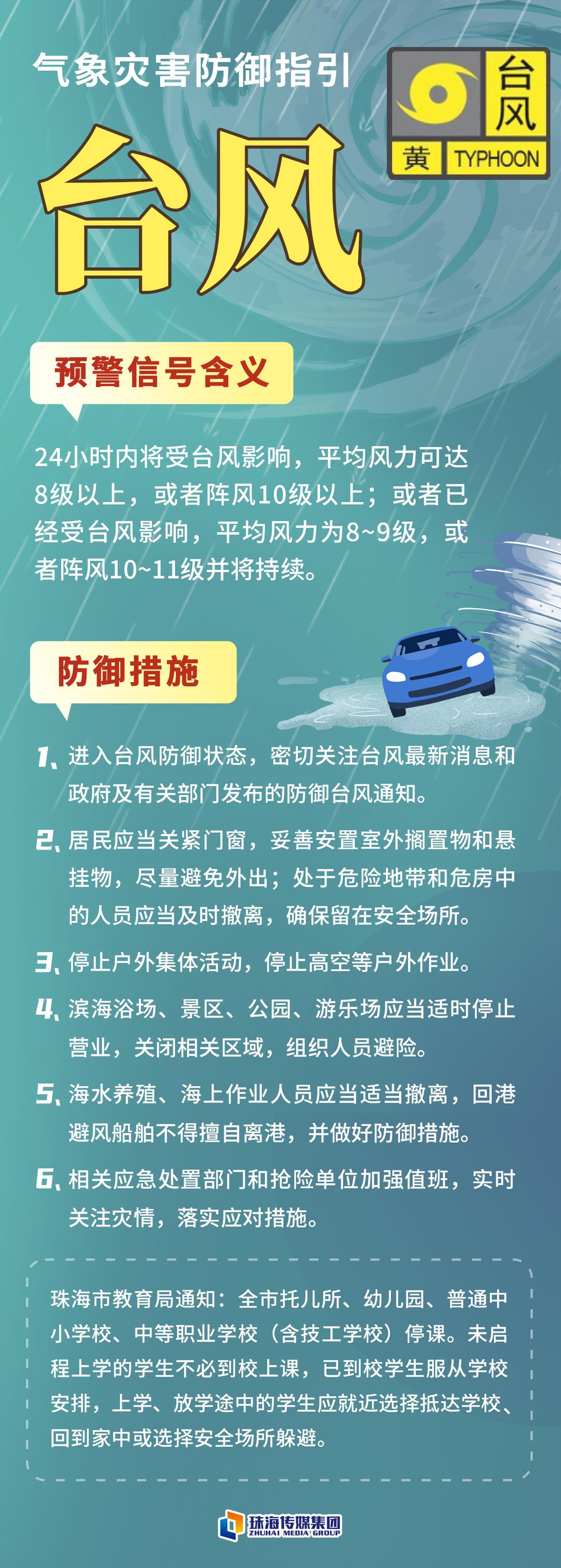 珠海市气象台8月24日06时00分发布,昨夜至今,强热带风暴“马鞍”(10级)快速西北行,强度维持。24日05时,其中心位于我市东南方约580公里的南海东北部海面上,预计其将以25公里左右的时速向西北方向移动,强度有所加强,25日以强热带风暴级或台风级登陆广东中西部沿海。受其影响,预计我市今天(24日)午后转雷阵雨,局部伴有9级左右短时大风,夜间起风力加大;25日有大暴雨,陆地风力9-10级阵风11-12级,沿岸和海面风力10-11级阵风12-13级。市气象台已将台风预警信号升级为黄色,请继续做好各项防御工作。