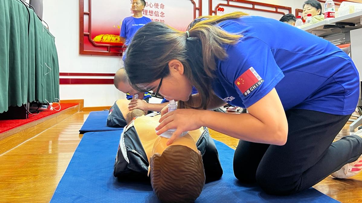 培训现场,蓝海应急救援中心教官采取视频讲解、边看边做、逐项考核的方式,以国际救援AHA急救知识为蓝本,专业详实地讲解了心肺复苏、AED的使用、气道硬物梗阻和止血包扎等院前急救知识,逐个考核参训人员技能掌握情况,及时纠正指导技术要点。