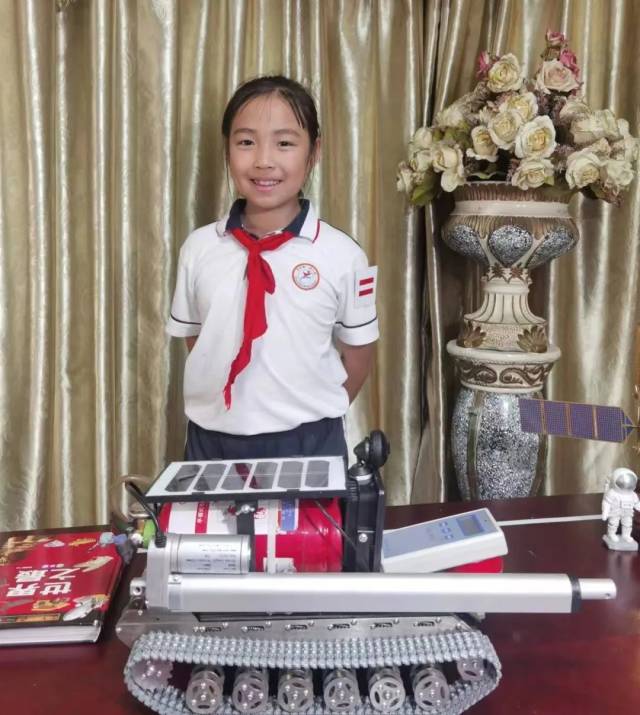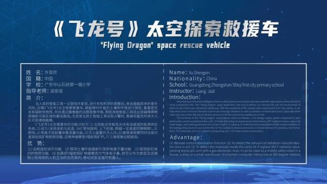 在智博会青少年专利孵化展中,中山石岐第一城小学的许圣欣同学发明的《“飞龙号”太空救援车》成功入围并荣获金奖,是中国参赛者金奖获得者最小的选手。