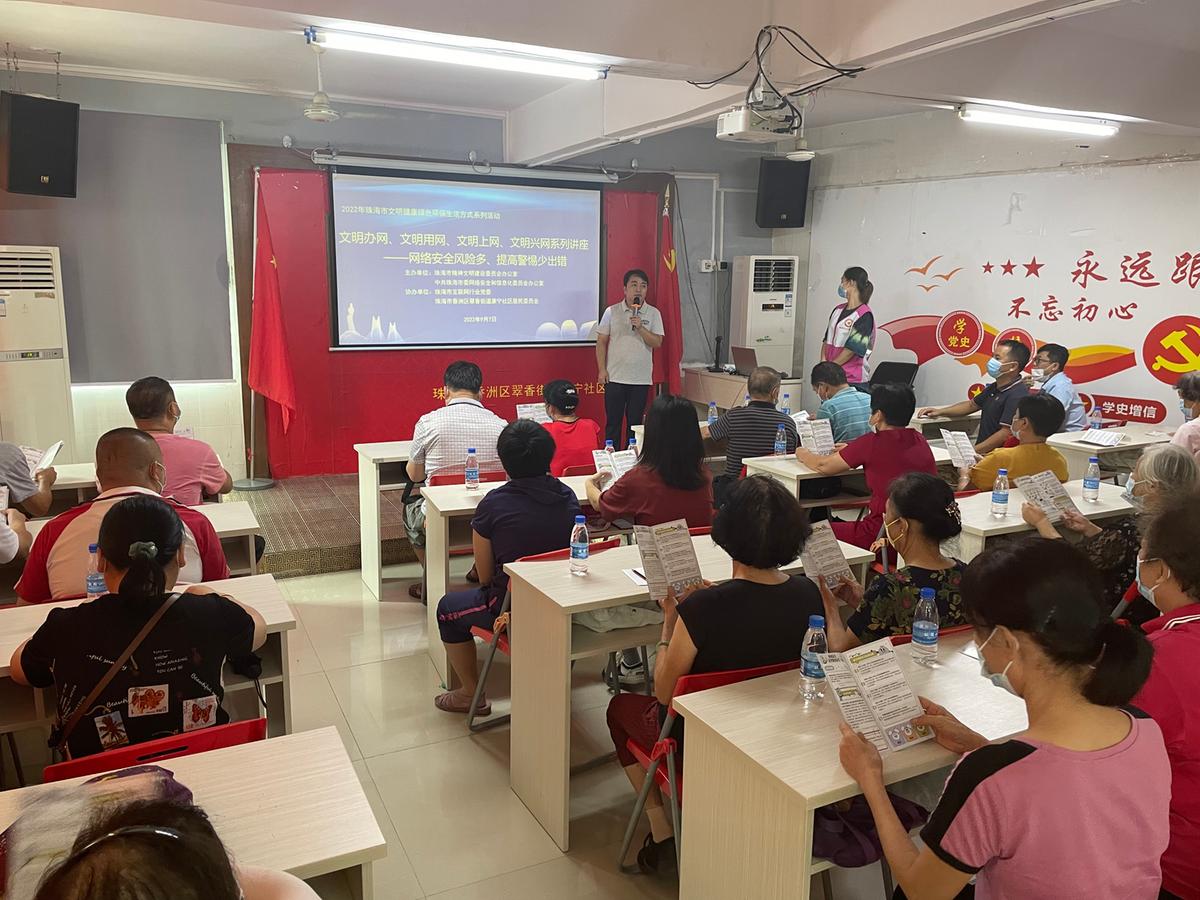 9月7日上午,为提高社区居民防范网络诈骗安全意识,宣传文明健康绿色环保生活方式,培育文明习惯,倡导文明新风,市委网信办联合香洲区康宁社区,在社区新时代文明实践站开展文明健康绿色环保生活方式宣传活动,吸引近50名社区居民参加。