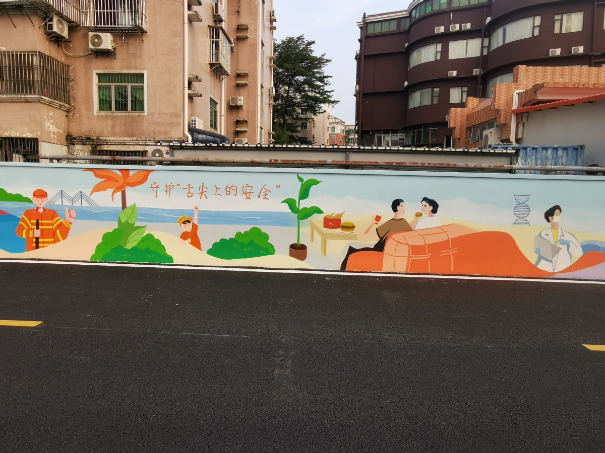 日前,在拱北街道港昌社区海荣新村交市十一中的万和街围墙内,一幅幅色彩鲜艳、形象生动的墙体彩绘吸引了许多居民驻足欣赏。穿行其间,看围墙换新装,文明标语、特色墙绘与周围整洁的住宅小区巧妙融合,相映成趣,成为了城市里靓丽的风景线。