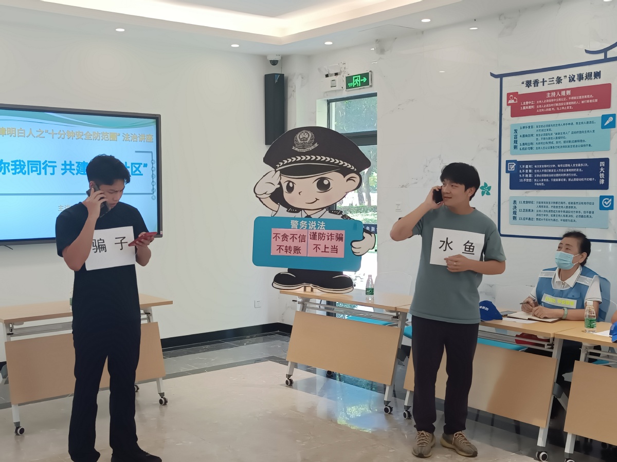 在讲座现场,辖区民警采用现场情景剧的方式,分组饰演了“骗子与水鱼”的电话诈骗案,街坊巡逻队的参训学员们分别在“金融诈骗”案件情景中扮演不同角色,通过声音、对话、表情等演绎方式,学员们充分体验了如诈骗对象、家人以及其他参与人等的切身感受,从内心深处增强了对金融诈骗的定义类型、实施金融诈骗的法律责任、如何防止金融诈骗,以及遭遇到金融诈骗应该如何应对的维护居民安全防范的技能。