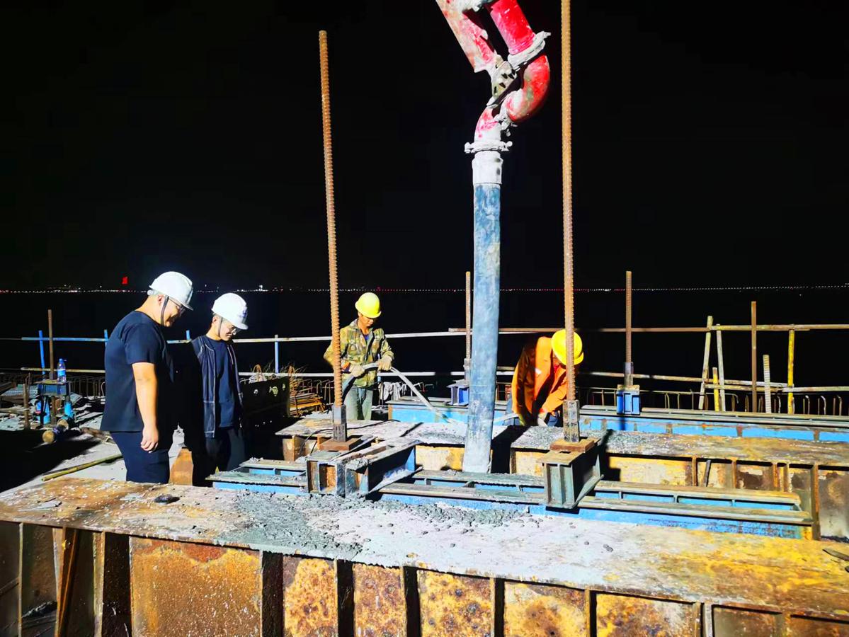 连续刚构桥是桥梁的一种结构体系,其特点是梁的跨径较大。金海大桥跨越磨刀门、白藤河水道以及鹤洲岛,在不同区域根据受力、通航等需要,有不同的结构形态。其中,在跨越磨刀门水道的4塔斜拉桥以西,约有400米属于连续刚构桥,最大的一跨长达180米。因为金海大桥是一座公铁同层的大桥,中间铺设设计时速160公里的城际轨道,两侧为设计时速100公里的高速公路,所以这部分桥的梁在混凝土浇筑阶段需要分铁路、公路,共计6个边跨、3个中跨,9个合龙点进行施工。今年8月金海大桥连续刚构段首个边跨完成混凝土浇筑,随后中铁大桥局的建设者再接再厉,科学把控施工节奏,最终在本月内完成所有合龙点的浇筑,顺利让这段桥梁合龙贯通。
