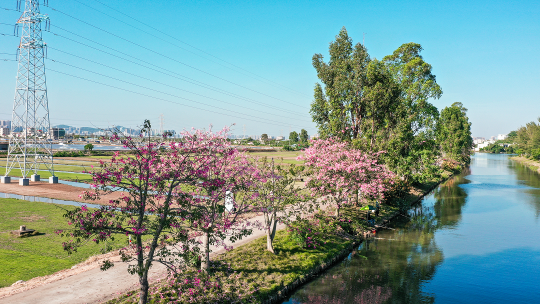 10月26日,在珠海市金湾区红旗镇,异木棉美丽绽放,一派明媚灿烂的秋日景象。图为红旗镇X589县道(红灯路段)开得正好的异木棉。