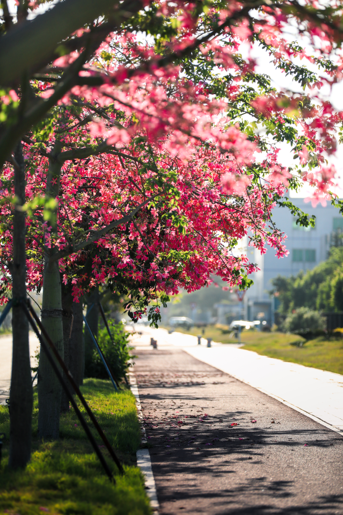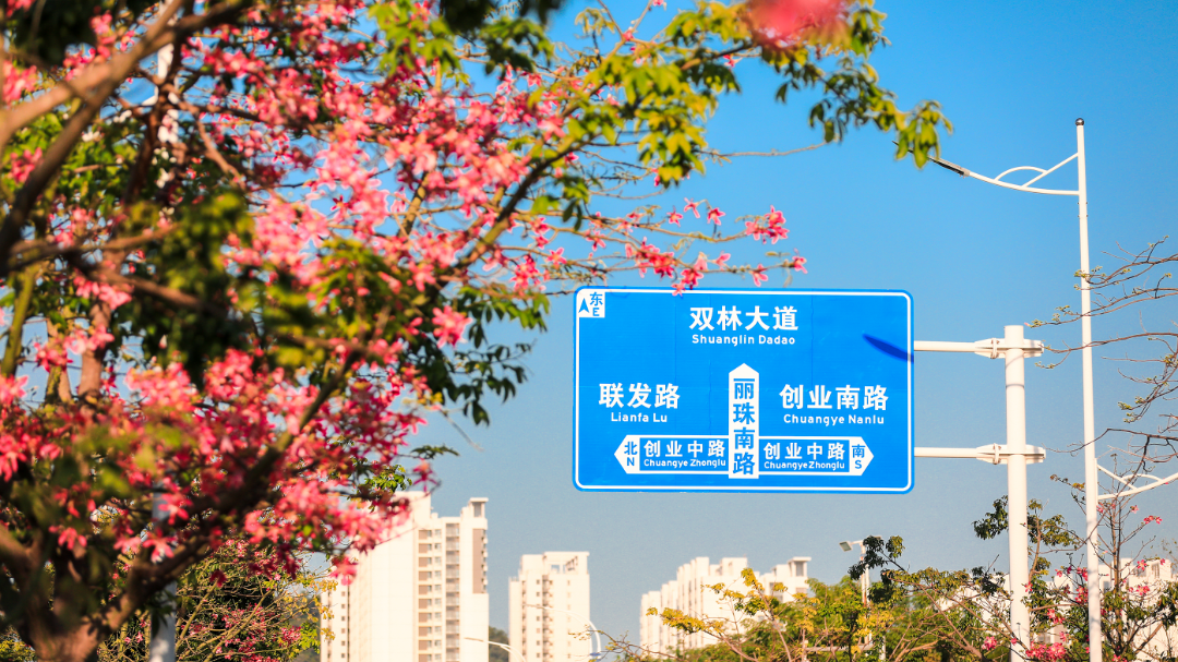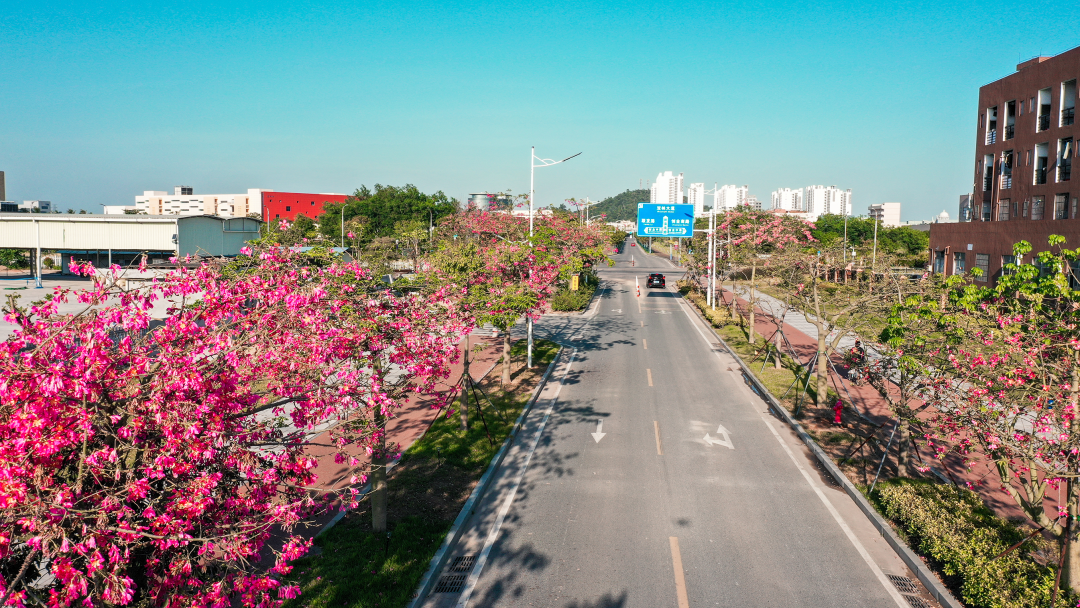走在红旗镇丽珠南路的街道上,异木棉花朵开满枝头。