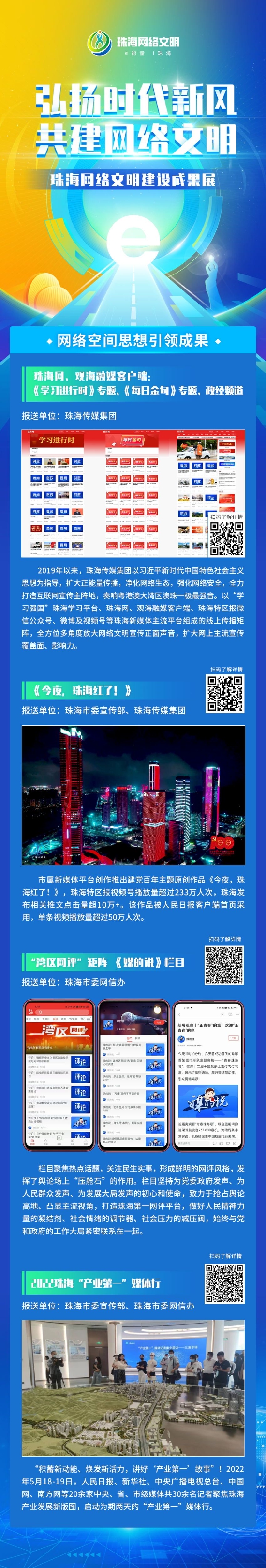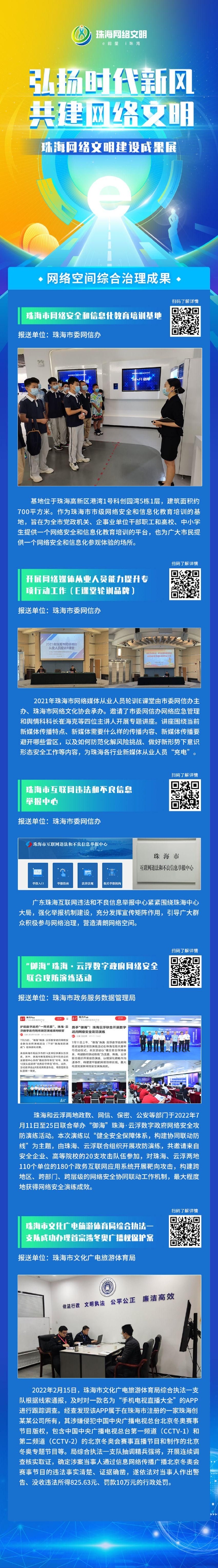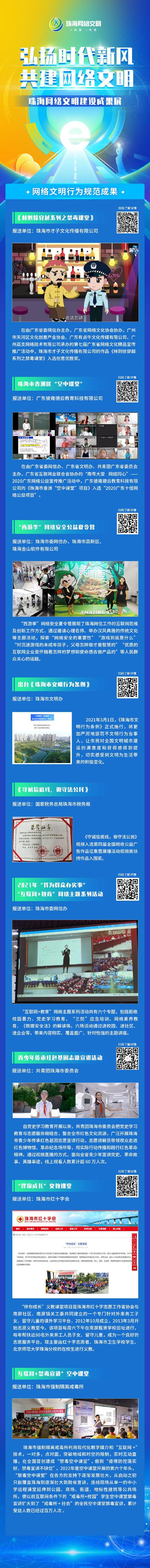【速来围观!珠海网络文明建设成果展出】互联网是亿万民众共同的精神家园,近年来,珠海在聚焦核心做强网上主流舆论、价值引领繁荣网络文化、典型示范强化网上道德引领、素质培育加强网上行为规范、综合治理净化网络内容生态、擦亮品牌深化网上文明创建等方面取得实效。戳长图,抢先看珠海网络文明建设成果↓↓ 珠海网络文明建设成果也将在11月3日举行的首届珠海网络文明大会同步展出,敬请期待!
