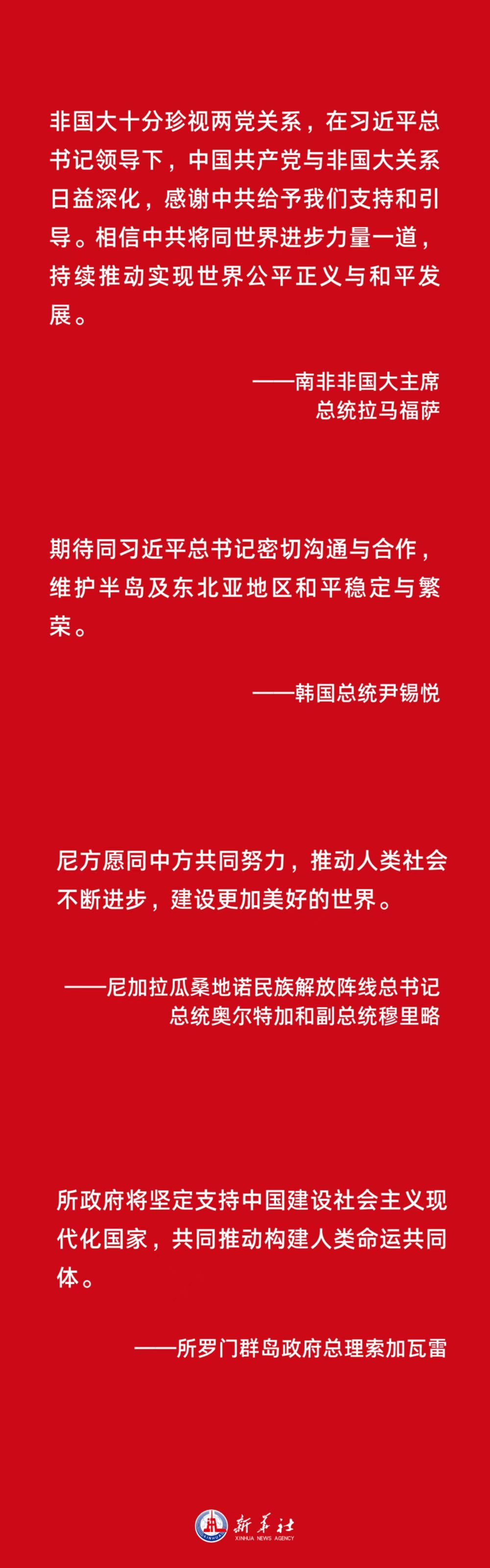 南非非国大主席、总统拉马福萨表示,非国大十分珍视两党关系,在习近平总书记领导下,中国共产党与非国大关系日益深化,感谢中共给予我们支持和引导。相信中共将同世界进步力量一道,持续推动实现世界公平正义与和平发展。