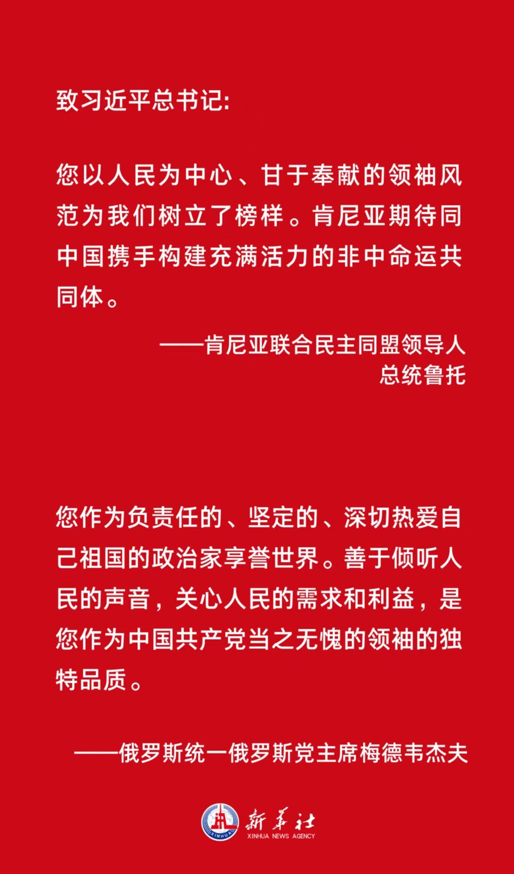 肯尼亚联合民主同盟领导人、总统鲁托表示,您以人民为中心、甘于奉献的领袖风范为我们树立了榜样。肯尼亚期待同中国携手构建充满活力的非中命运共同体。